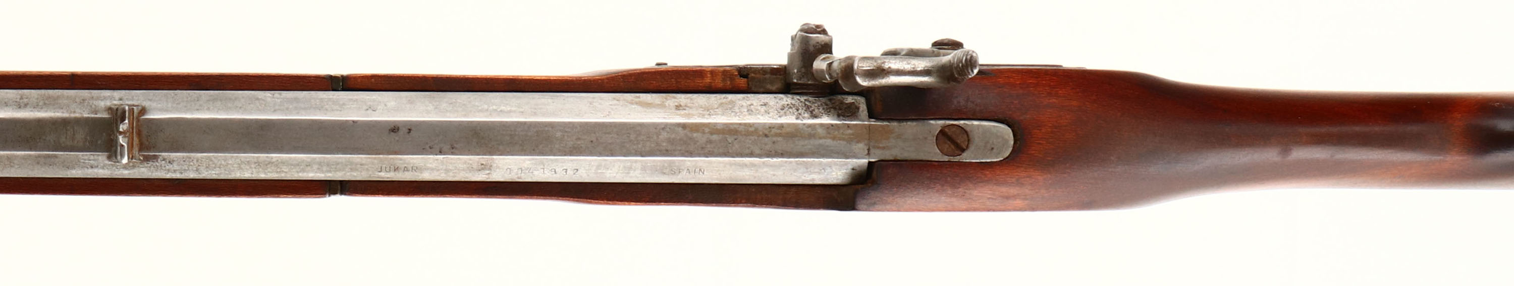 Jukar. Cal: .45. MFG: unknown. S/N: 0043932. Percussion Muzzleloader. 33 1/2'' Barrel. The straight wrist wood stock is excellent with light scratches. Metal is a gun metal gray with rust speckling. Left side of barrel is marked ''JUNKAR'', S/N, ''SPAIN''. Bore is very good with crisp rifling. Blade front sight, Fixed U-notch rear sight. Brass buttplate. Comes with ram rod. Muzzleloader No FFL Req. - Value: 100 to 300