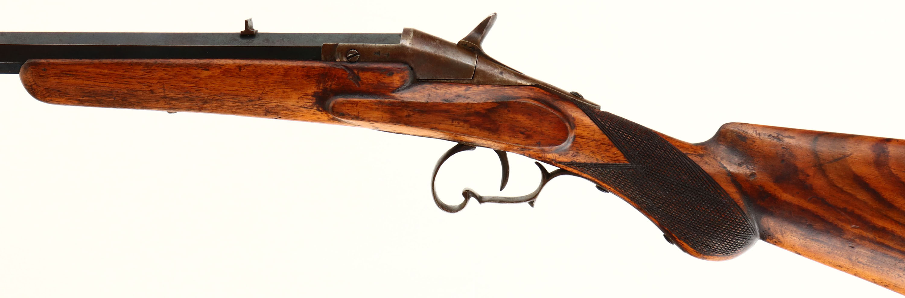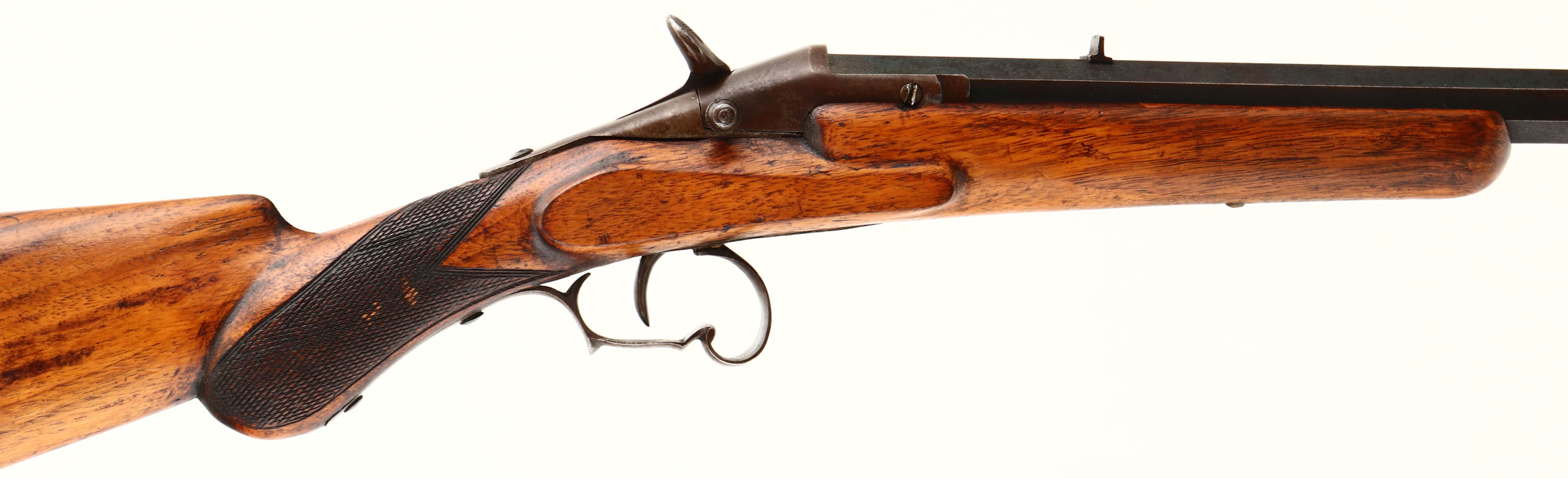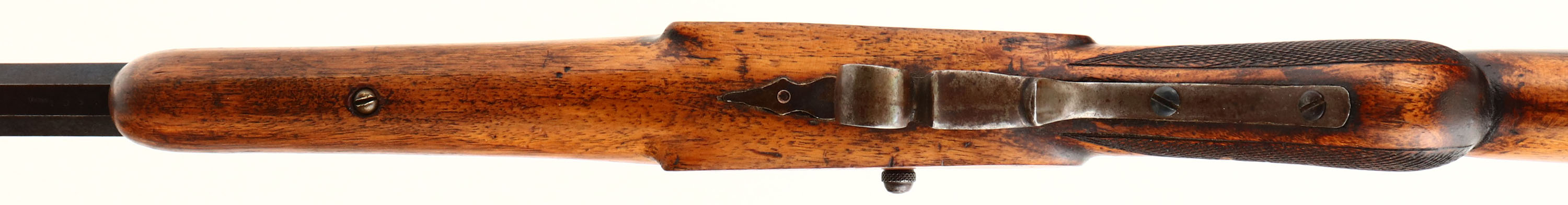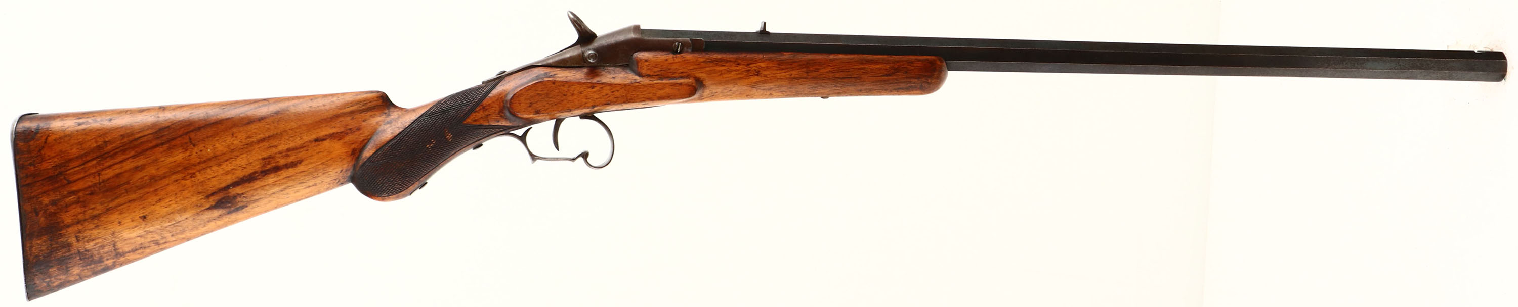 Belgian, Flobert, CAL: barrel marked FL.22.L (muzzle dia 0.465''), MFG: Antique, SN: 105, Breech Loading Single Shot Rifle, 23 1/2'' barrel. The refinished checkered round knob wood stock is very good, displaying contusions, scrapes & dings. The metal finish has toned to a mix of remaining blue & brown patina & the receiver has fully toned to brown patina. Bore is good, with visible rifling. The rifling appears crude, but looks original. The barrel holds a fixed notch rear sight & blank front dovetail. Stock carries a smooth metal buttplate. Antique, No FFL Req. - Value: 100 to 300