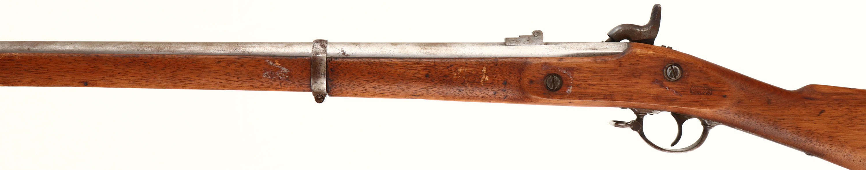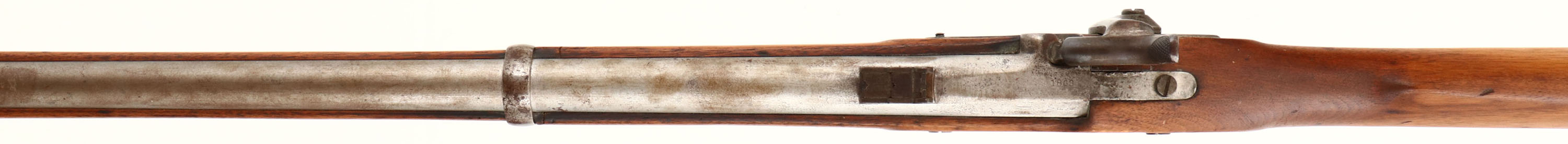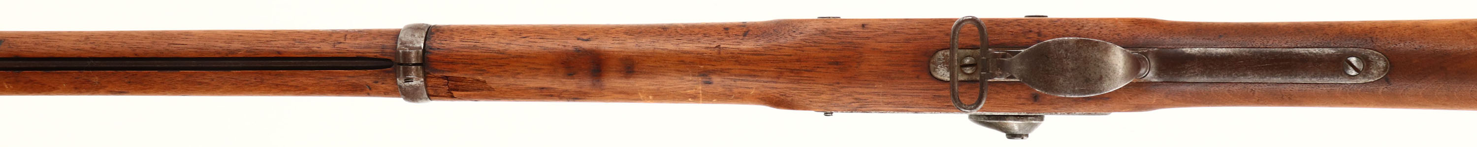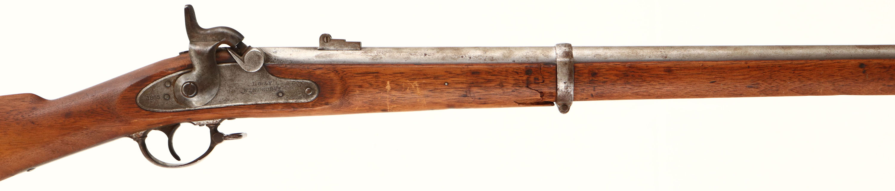 L.G. & Y. Model: 1861 Contract Musket. Cal: .58. MFG: 1863. S/N: N/A. Percussion Muzzleloader. 40' Barrel. The straight wrist wood stock is very good with crack on left & right side of stock behind rear barrel band, scratches, dents, chips & wear from use & age, Cartouche on left side of stock above trigger. Metal parts are gun metal gray with rust speckling, lock plate is marked ''1863'', ''L.G. & Y. WINDSOR-VT'', ''US'' eagle, Barrel is marked ''1863'', ''V'', ''P'' over eagle. Bore is good with light pitting. Barleycorn front sight, three position U-notch rear sight. Metal buttplate with rust speckling, hand marked ''XXV'' on upper tang & ''US'' on upper tang. Rear sling swivel, comes with ram rod. Muzzle loader No FFL Req. - Value: 200 to 400