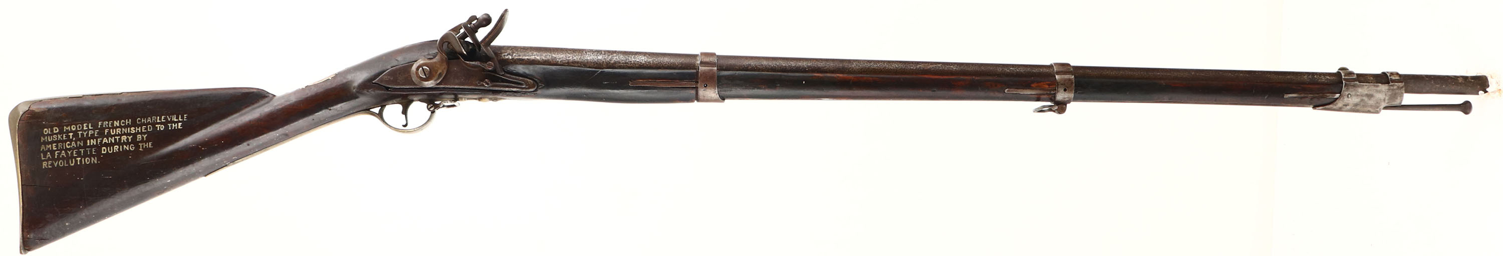 French. Model: Old Model Charleville. Cal: .69. MFG: 1754. S/N: N/A. Flintlock muzzleloader. 40'' Barrel. The straight wrist wood stock is good with scratches/cracks/chips/dents/grain cracks/pieces missing & wear from use & age, Darkening from oil/age, Marked on right side rear of stock ''OLD MODEL FRENCH CHARLEVILLE MUSKET, TYPE FURNISHED TO THE AMERICAN INFANTRY BY LA FAYETTE DURING THE REVOLUTION'', brass decoration piece at top of wrist. All metal parts toned to a even brown patina, rust & pitting. Lock plate is marked ''1754'', ''US'', unknown marking. Bore is poor, dark with rust & pitting. Blade front sight on front barrel band. Brass engraved buttplate that's worn. Bottom sling swivels, comes with ram rod. Lock does not function properly. A rare & old piece that is still in good shape for its age, a great opportunity to own a rifle that helped make this country. Muzzleloader No FFL Req. - Value: 200 to 1000