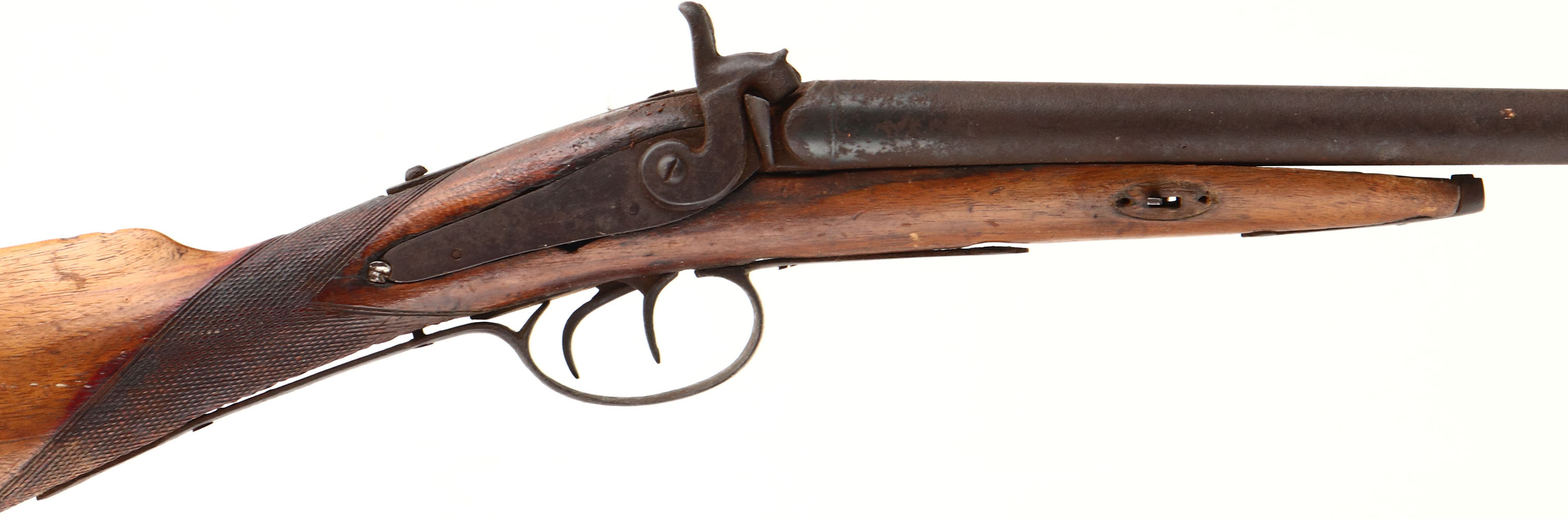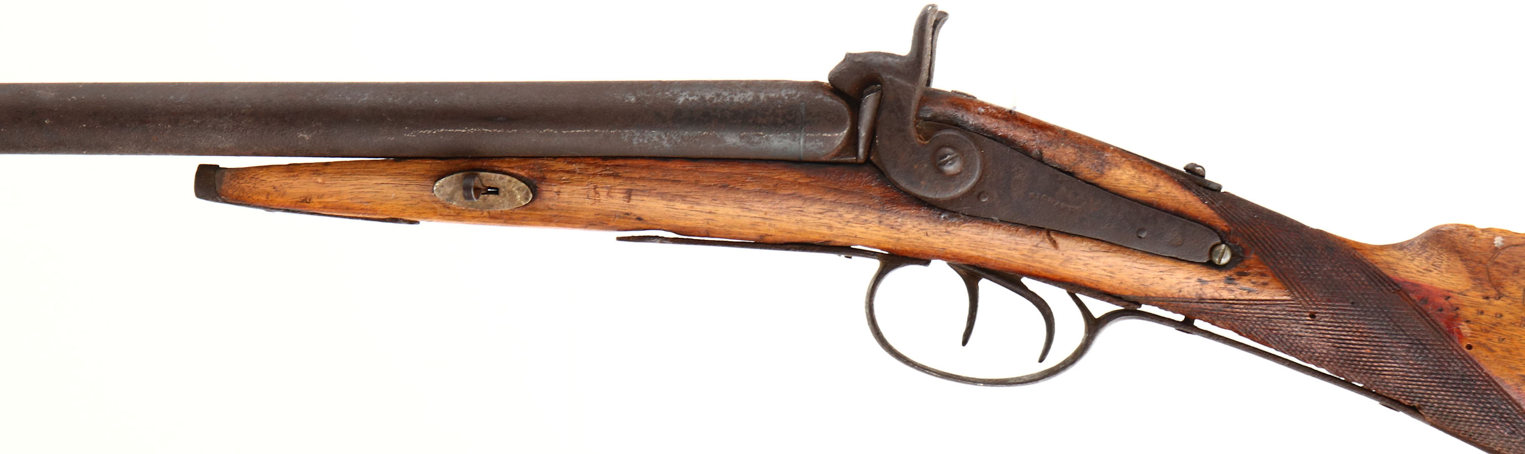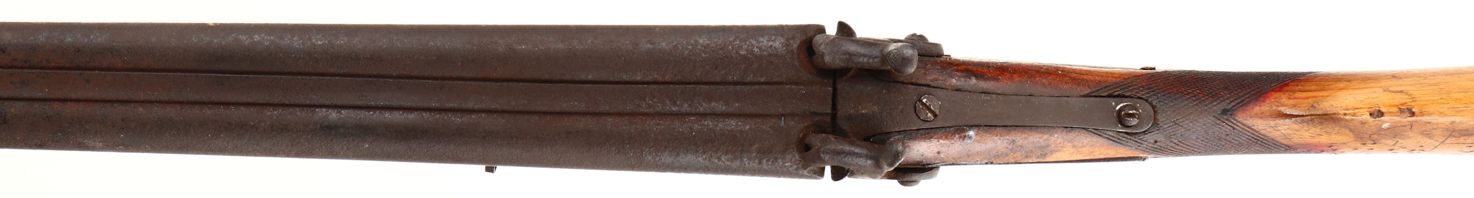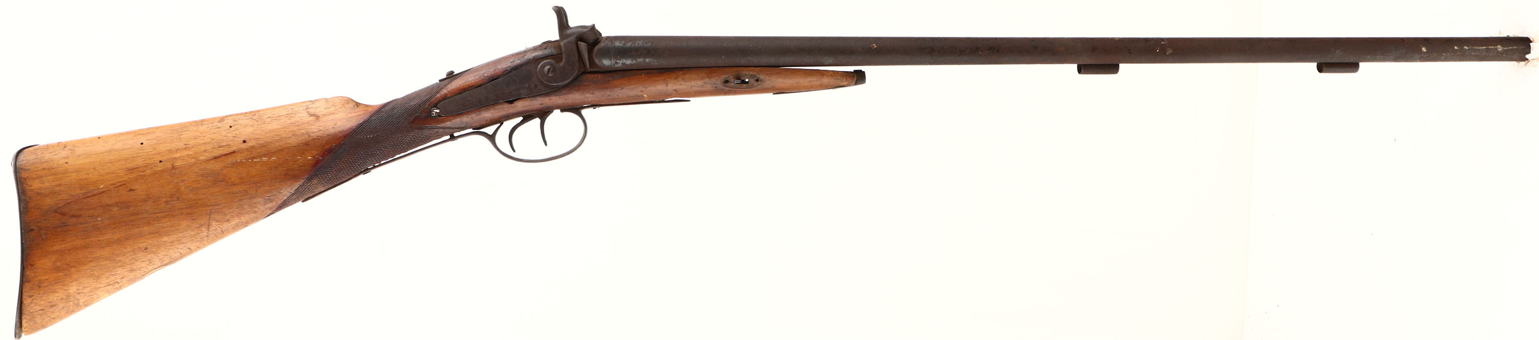 NON-FUNCTIONING, Richards, Muzzleloader, CAL: 12GA, MFG: Antique, SN: N/A, Percussion SxS Muzzleloading Shotgun, 29 1/2'' barrels. The checkered straight grip wood stock is poor, displaying numerous defects. The metal finish has toned to an even brown patina. Bores are poor. The solid rib holds a single front bead, Buttstock carries a smooth metal buttplate. No ramrod. Trigger guard loose. Pin holding forend. Wall hanger or project gun. Antique, No FFL Req. - Value: 50 to 100