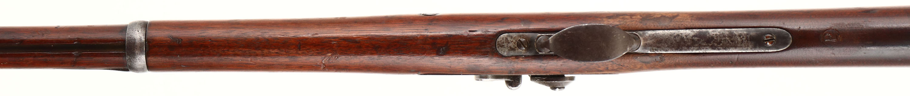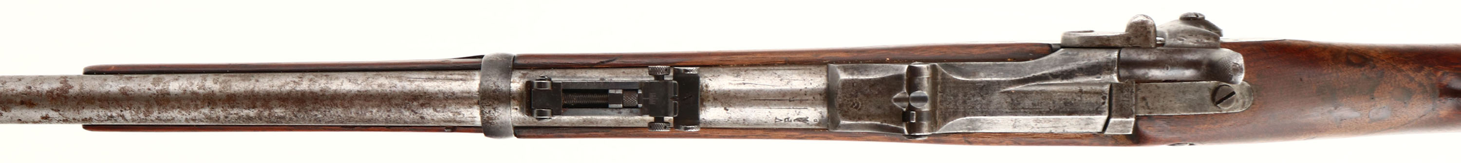 Springfield. Model: 1873. Cal: 45-70. MFG: 1883. S/N: 216284. Trapdoor Breech loader. 32 1/2'' Barrel. The straight wrist wooden stock is good, stock has been cut down, tight repaired crack at top of wrist that wraps around stock towards the receiver. Scratches, chips, dings, dents & wear from use/age, ''P'' in circle Cartouche on bottom of stock behind . Metal finish remain in protected areas with rest of metal worn to a gun metal gray or brown patina with rust speckling. Rear of receiver is marked with S/N, top of breech block is marked ''U.S. MODEL 1873'', left side of barrel is marked ''V'', ''P'' over eagle, ''P''. Bore is good with one spot of light pitting & light roughness. Hooded blade Front sight, V-notch tangent rear sight marked 100 to 6. Metal buttplate that's worn to a brown patina & has cleaned pitting, upper tang marked ''US''. No sling swivels. Antique No FFL Req. - Value: 200 to 400