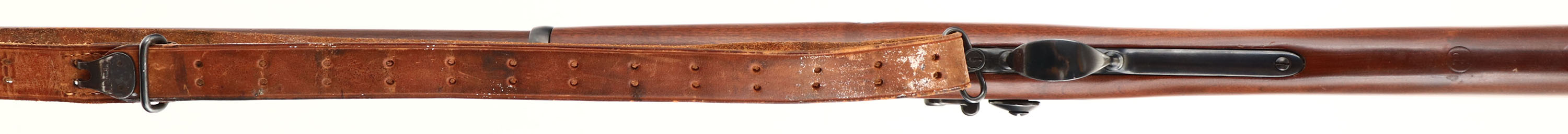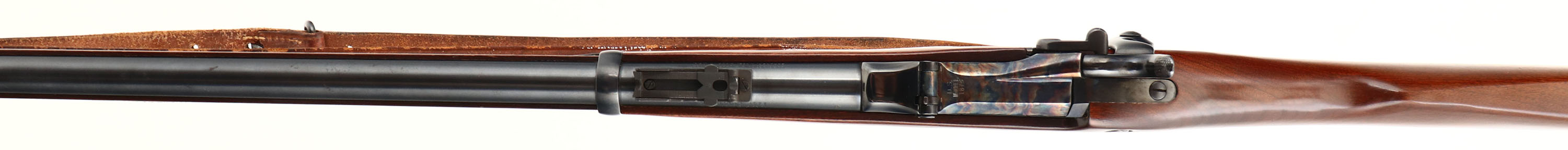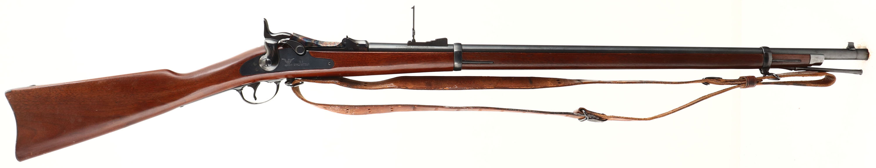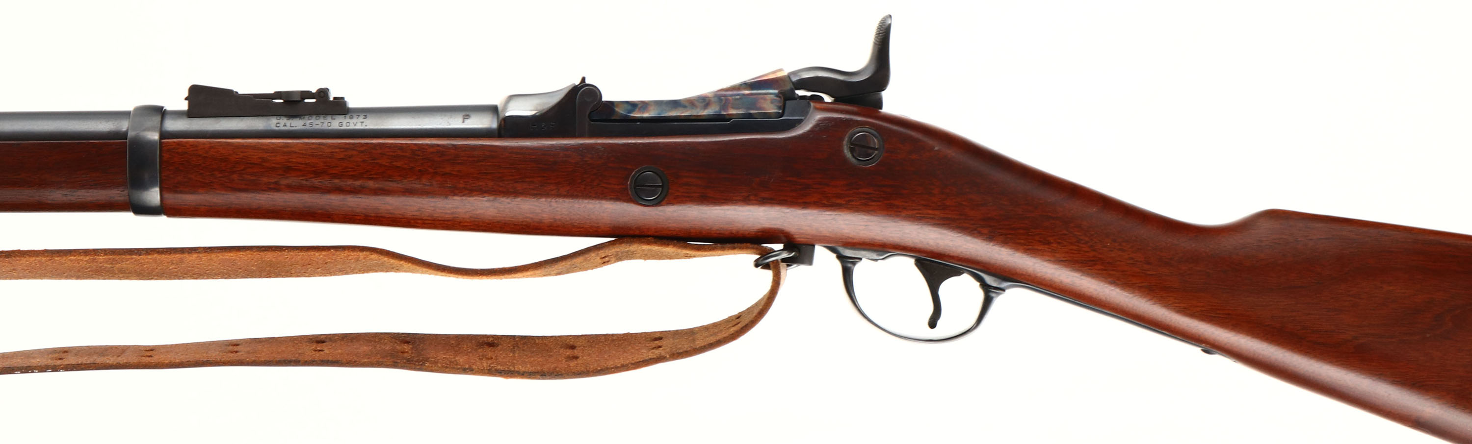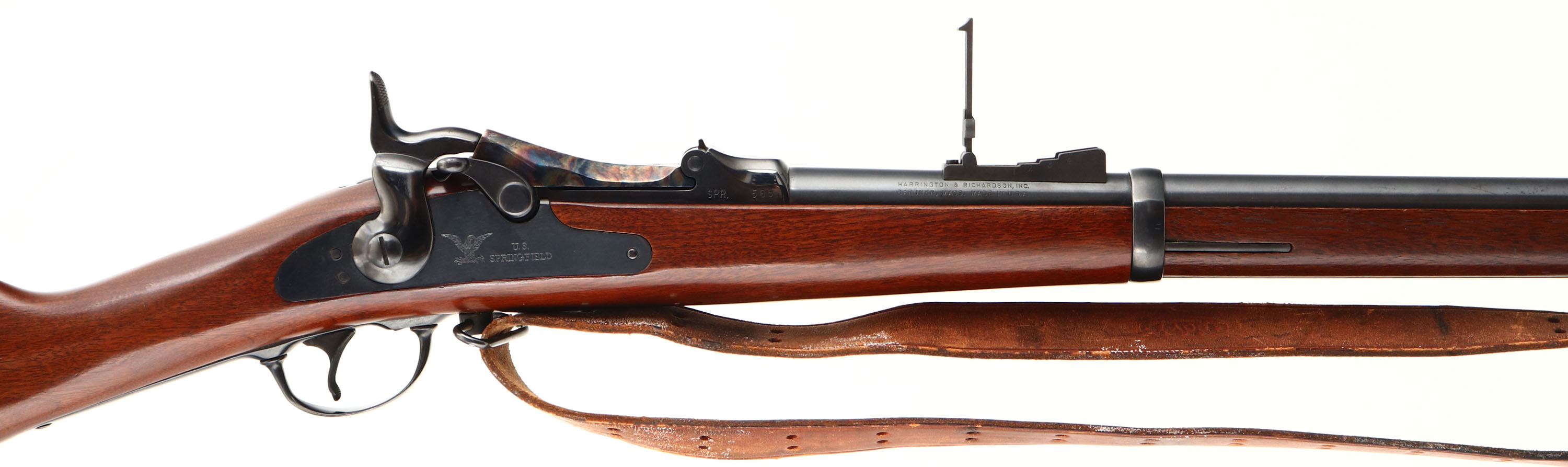 Harrington & Richardson. Model: 1873. Cal: 45-70 Gov't. MFG: 1970s. S/N: 565. Trapdoor breech loader. 31'' Barrel. The straight wrist wood stock is excellent with minor scratches & wear. ''P'' in circle Cartouche in belly of stock. The metal finish rates 98%. Top of breech block is marked ''U.S. MODEL 1873'', left side of receiver is marked ''H&R'', Right side of receiver is marked with S/N, Lock plate is marked ''U.S.'', ''SPRINGFIELD'', left side of barrel is marked ''U.S. MODEL 1873'', ''CAL. 45-70 GOV'T'', ''P'', Right side of barrel is marked ''HARRINGTON & RICHARDSON, INC.'', ''WORCESTER, MASS. MADE IN U.S.A.''. Bore is excellent. Front brass bead sight, Rear stepped wide V-notch sight. Metal buttplate marked ''US'' on upper tang. Comes with cleaning rod & leather sling. A excellent & Beautiful reproduction of a classic American rifle. FFL Req. - Value: 600 to 1200