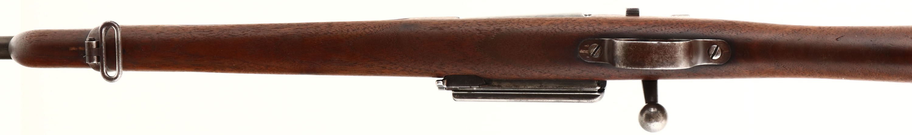 Springfield Armory. Model: 1899 Carbine. Cal: 30-40 Krag. MFG: 1901. S/N: 309297. Bolt action Rifle. 22'' Barrel. The straight wrist pistol stock is excellent with minor scrapes & contusions. The metal finish rates 30 % on receiver with most parts turned to a gun metal gray, The metal finish on the barrel rates, 80% with spots of thinning bluing. Right side of receiver by bolt handle has been drilled & tapped with screws inside, left side of receiver is marked, ''U.S.'', ''MODEL 1899 SPRINGFIELD ARMORY.'' & S/N. Bore is very good, bright with light roughness. Front blade sight, rear V-notch & aperture sight marked 2 to 20. Metal trapdoor buttplate worn gray & with patina. Bottom sling swivels. A Excellent Krag carbine. FFL Or C&R Req. - Value: 500 to 1000