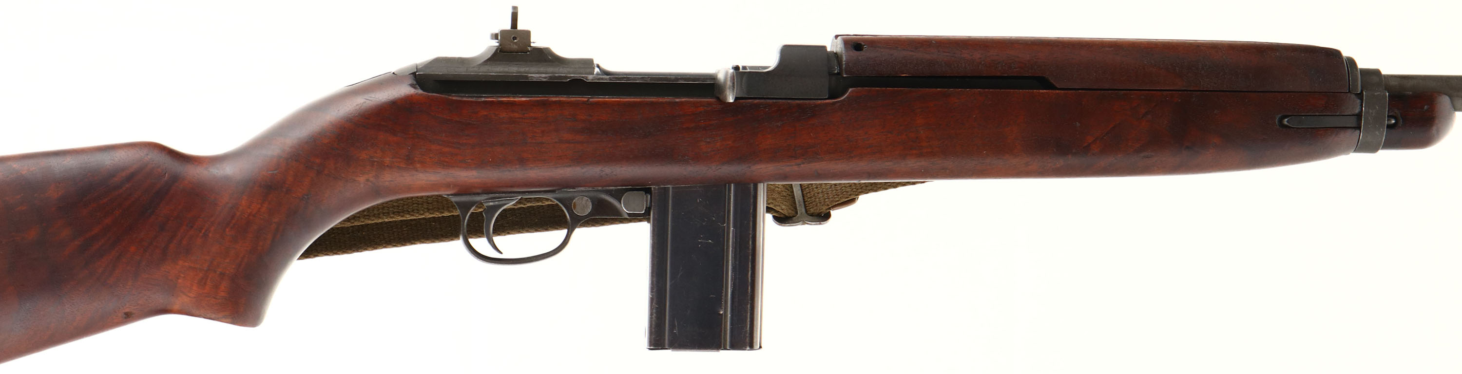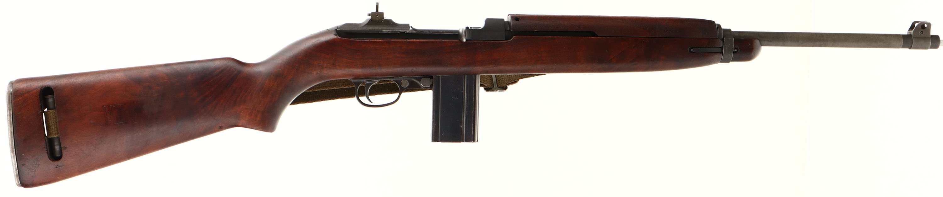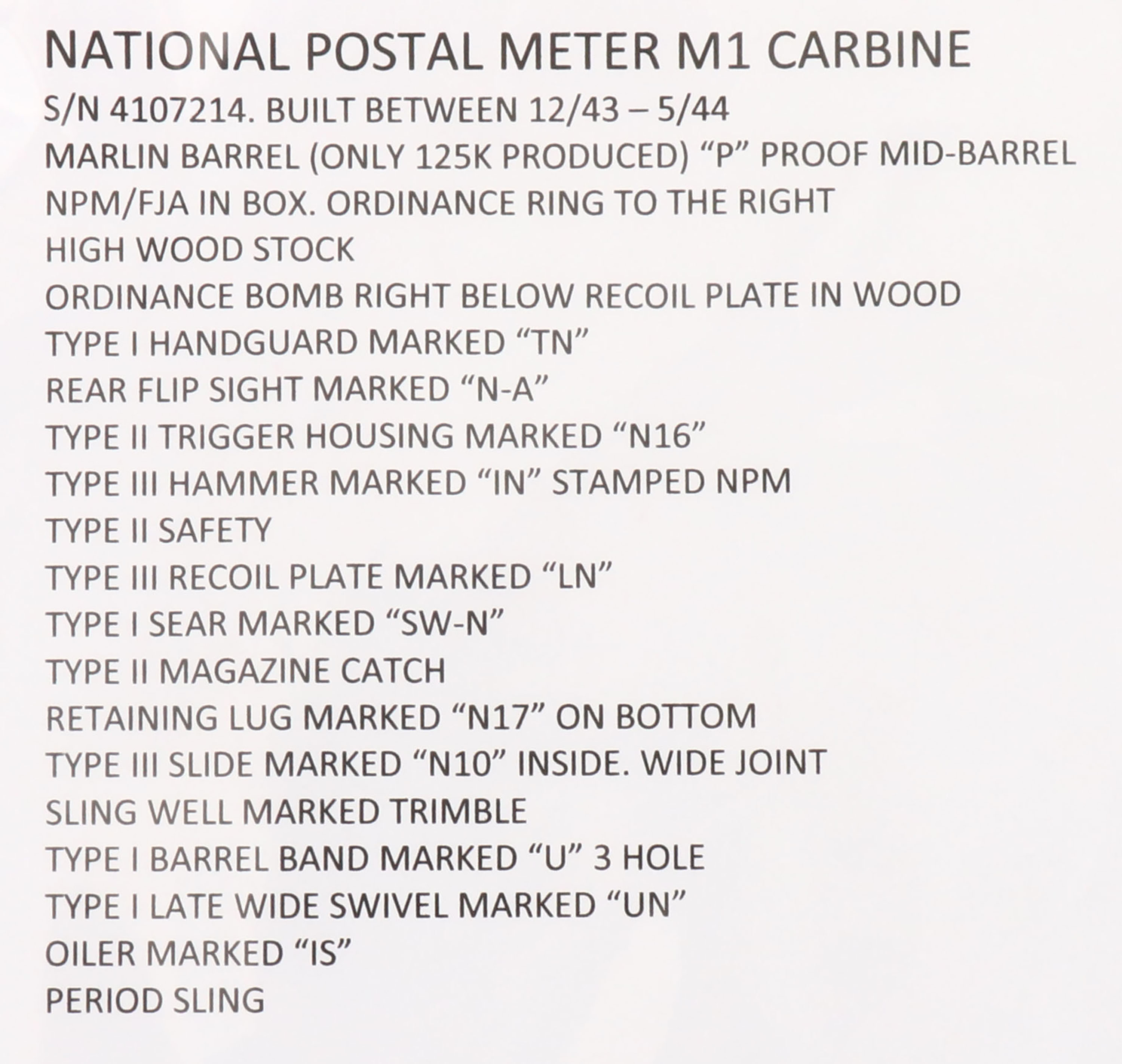 National Postal Meter, M1 Carbine, CAL: .30 Carbine, MFG: 1944, S/N: 4107214, Semi-Auto Rifle, 18'' Round Barrel. The refinished flat pistol grip wood stock is very good, displaying contusions, scrapes & dings, with areas darkened from oils. The stock displays cartouches, the right side is stamped ''NPM'', ''FJA'' in a box & ''Crossed Cannons''. The cartouche on the left side of the stock is very faint & not legible. Sling slot is marked, ''TRIMBLE''. The top of the wrist is stamped with ''Flaming Bomb''. The receiver rates 95% with light wear, & the barrel has toned to metal grey. The back of the receiver is marked in three lines, ''NATIONAL POSTAL METER, S/N''. The front top of receiver is marked, ''U.S.CARBINE'', ''CAL. 30M1''. The barrel band is marked, ''U'', front sling swivel marked, ''UN'' & top of the barrel end is marked, ''MARLIN''. Additional markings on the gun are as followed: Type II trigger housing marked ''N16'', Type II hammer marked ''IN'' & ''NPM'', Type III recoil plate marked ''LN'', Type I sear marked ''SW-N'', lug is marked ''N17'' on the bottom, Type III slide marked ''N10'' inside wide joint, Type I late swivel marked ''UN''. Bore is very good, bright & shiny with spots of roughness & thinned rifling. The barrel holds a blade front sight, with protective wings & is marked, ''N''. The rear sight is a two position aperture sight. Buttstock carries a checkered metal military style buttplate. Comes with correct period green cloth sling, & two 15 Rd. mags, one marked ''IA'', other is marked, ''SW''. This M1 Carbine is in its early configuration. There were only 125k produced with a Marlin barrel. FFL or C&R Req. - Value: 800 to 1600