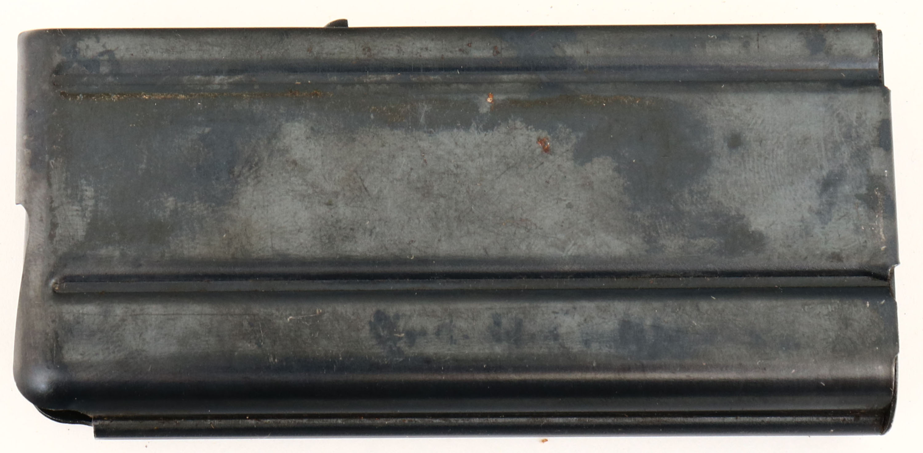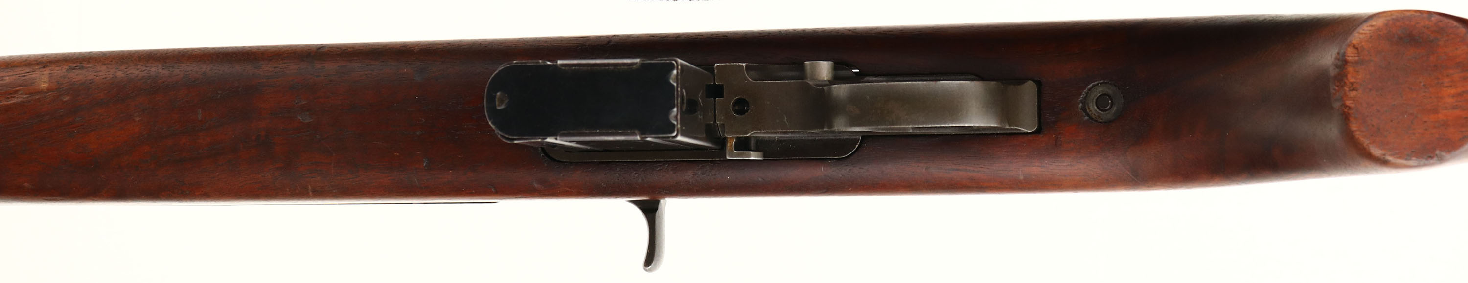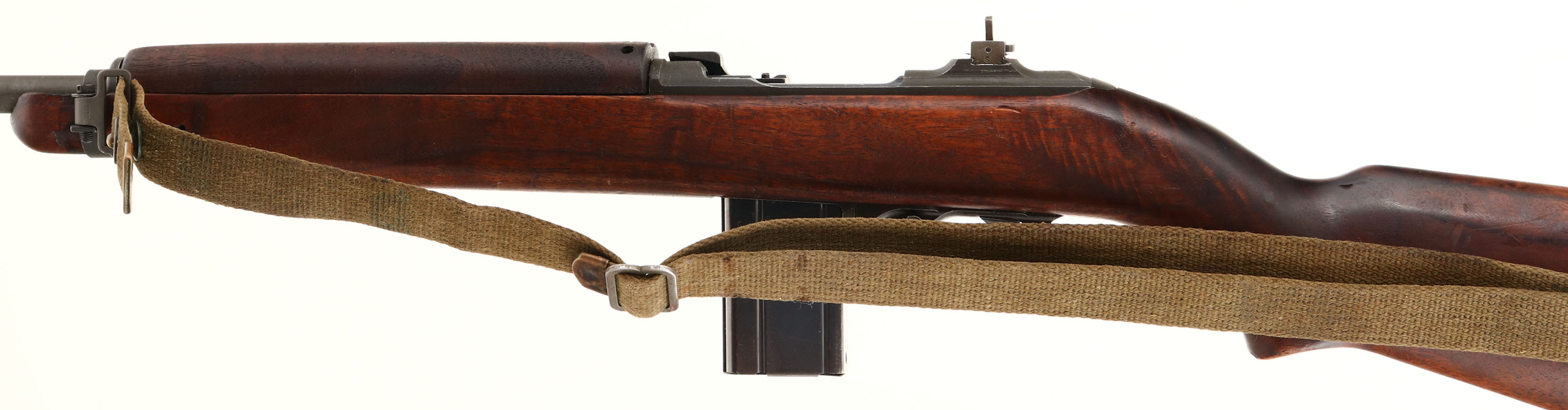 National Postal Meter, M1 Carbine, CAL: .30 Carbine, MFG: 1944, S/N: 4107214, Semi-Auto Rifle, 18'' Round Barrel. The refinished flat pistol grip wood stock is very good, displaying contusions, scrapes & dings, with areas darkened from oils. The stock displays cartouches, the right side is stamped ''NPM'', ''FJA'' in a box & ''Crossed Cannons''. The cartouche on the left side of the stock is very faint & not legible. Sling slot is marked, ''TRIMBLE''. The top of the wrist is stamped with ''Flaming Bomb''. The receiver rates 95% with light wear, & the barrel has toned to metal grey. The back of the receiver is marked in three lines, ''NATIONAL POSTAL METER, S/N''. The front top of receiver is marked, ''U.S.CARBINE'', ''CAL. 30M1''. The barrel band is marked, ''U'', front sling swivel marked, ''UN'' & top of the barrel end is marked, ''MARLIN''. Additional markings on the gun are as followed: Type II trigger housing marked ''N16'', Type II hammer marked ''IN'' & ''NPM'', Type III recoil plate marked ''LN'', Type I sear marked ''SW-N'', lug is marked ''N17'' on the bottom, Type III slide marked ''N10'' inside wide joint, Type I late swivel marked ''UN''. Bore is very good, bright & shiny with spots of roughness & thinned rifling. The barrel holds a blade front sight, with protective wings & is marked, ''N''. The rear sight is a two position aperture sight. Buttstock carries a checkered metal military style buttplate. Comes with correct period green cloth sling, & two 15 Rd. mags, one marked ''IA'', other is marked, ''SW''. This M1 Carbine is in its early configuration. There were only 125k produced with a Marlin barrel. FFL or C&R Req. - Value: 800 to 1600
