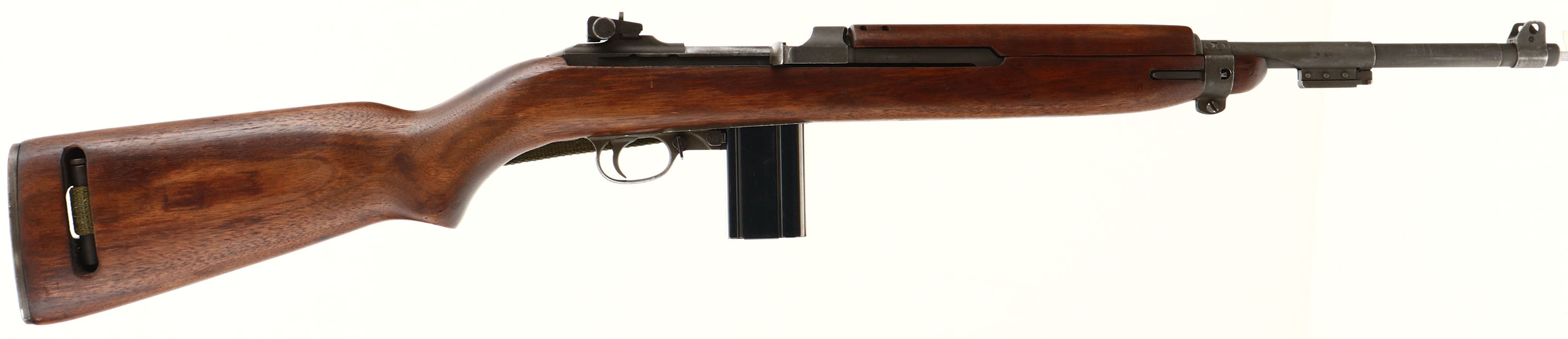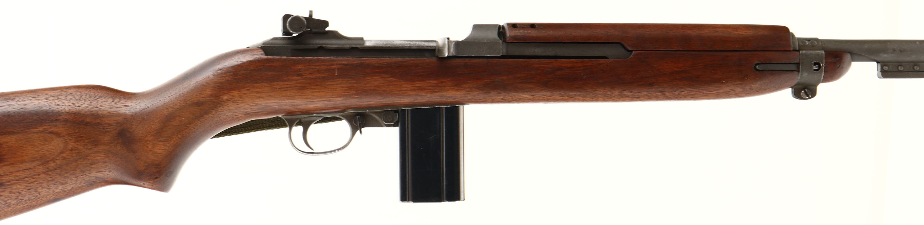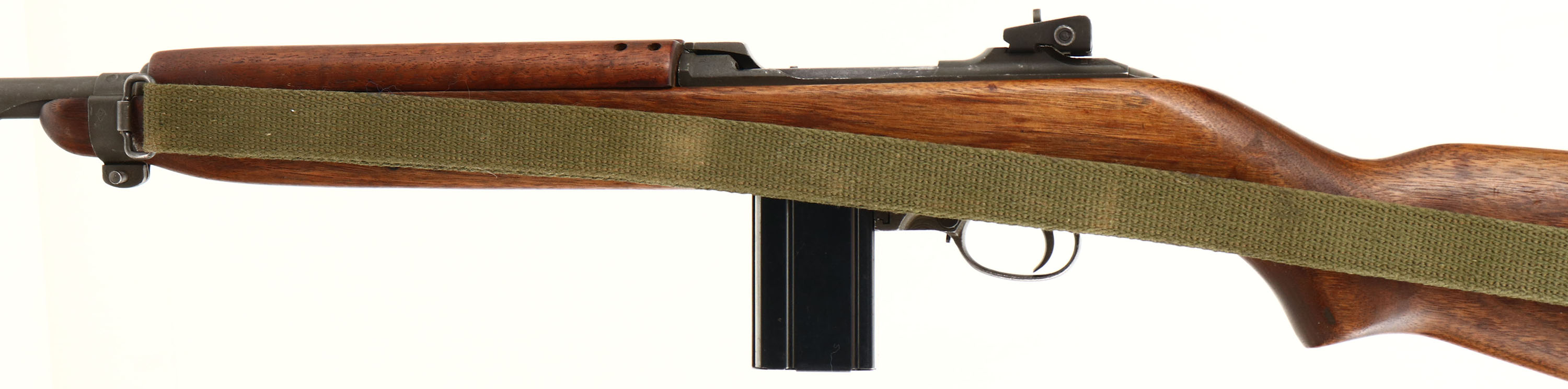 I.B.M, M1 Carbine, CAL: .30 Carbine, MFG: 1943-44, S/N: 3743814, Semi-Auto Rifle, 18'' Round Barrel. The flat pistol grip wood stock is excellent, as nicely refinished, displaying small handling marks, contusions & light scratches. Faint cartouche on right side of stock that is no longer legible. The military parkerized finish on the receiver & barrel rates 90%, displaying light scratches & scrapes. The back of the receiver is marked, ''I.B.M. CORP, SN'' & the top of receiver on the front is marked, ''U.S.CARBINE'', ''CAL. 30M1''. The bottom of trigger guard marked, ''O''. The barrel band is marked, ''O'' in diamond & the top end of barrel marked, ''I.B.M CORP.'', ''11 43'' over ''Flaming Bomb''. Bore is very good, bright & shiny amongst thinned rifling. The barrel holds a blade front sight, with protective wings & the rear sight is a windage/elevation adjustable aperture sight, with graduations from 1 to 3. The buttstock carries a checkered military style buttplate. Comes with sling, oiler bottle, 15 Rd. mag marked ''UU'' & an additional 5 Rd. mag. FFL or C&R Req. - Value: 800 to 1600