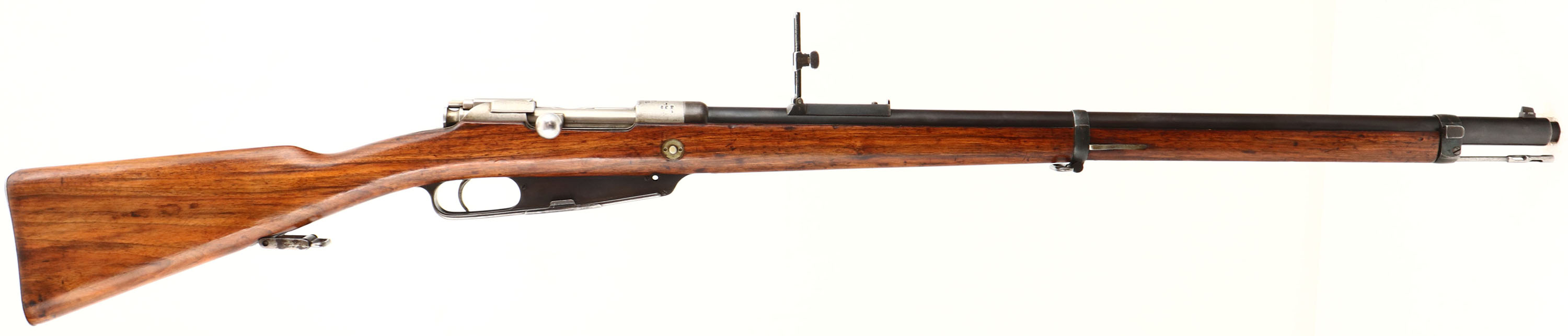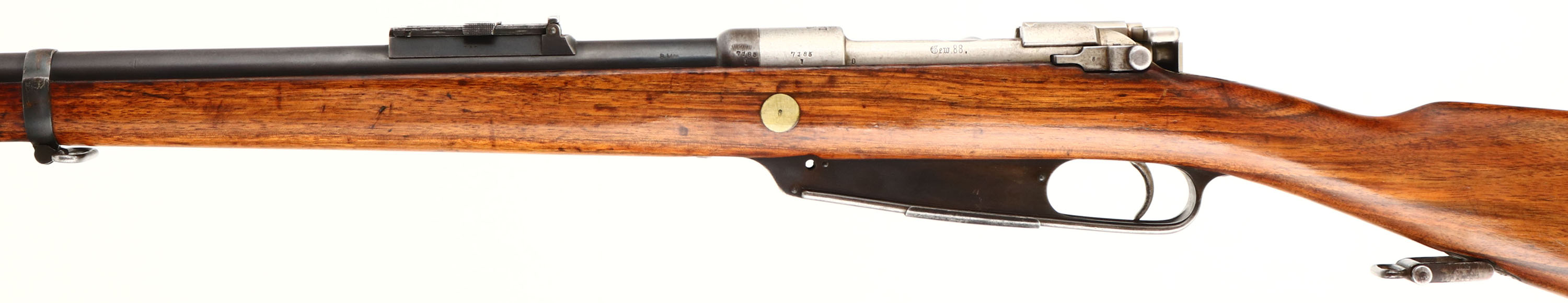 Danzig. Model: 88/05. Cal: 7.92x57mm. MFG: 1891. S/N: 71851. Bolt Action Rifle. 29 1/4'' Barrel. The straight wrist wooden stock is very good with scratches/dents & wear from use & age, Stock appears to have been lightly sanded & re-finished, worn cartouches on bottom of stock by wrist that reads, crown over ''B'', ''X6''. The metal finish rates 90% on barrel with spots of brown patina & lightly thinned bluing, Receiver was left in the white (Not Blued) From factory. Left side of receiver is marked with S/N, ''GEW.88'', top of receiver is marked with Crown, ''S'', ''DANZIG'', ''1891'' & proof marks, Left side of barrel is marked with S/N, ''8MM''. Bore is very good with light roughness. Barleycorn front sight, V-notch ladder rear sight that's marked in Turkish. Metal buttplate worn to a gun metal gray. Bottom sling swivels, has cleaning rod, comes with bayonet & sheath. A excellent example of Germanys first smokeless powder rifle. Antique No FFL Req. - Value: 300 to 600