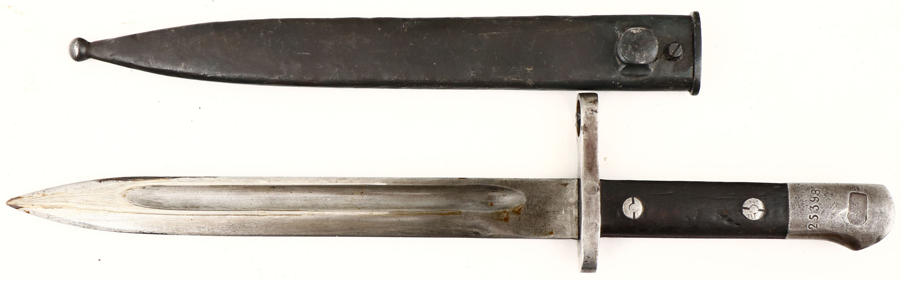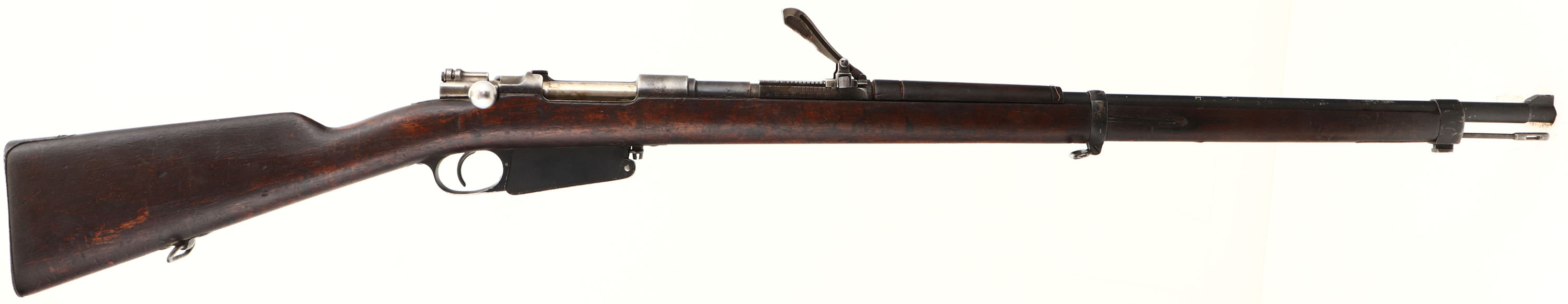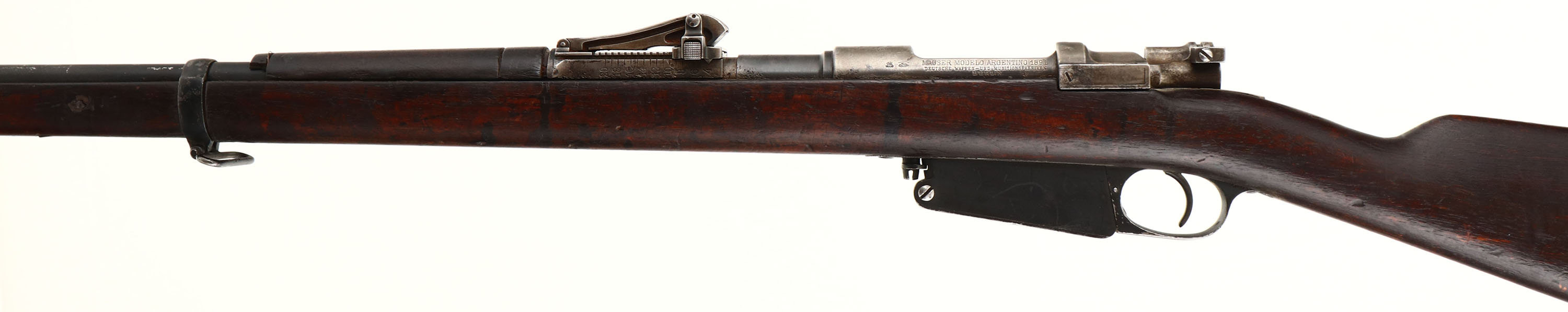 DWM. Model: 1891/12. Cal: 7.65x53mm. MFG: 1900-1909. S/N: W0065. Bolt action rifle. 29'' Barrel. The straight wrist wood stock is very good with scratches, dents, gouges, oil darkening & Wear from use/age, chip in end of upper handguard, one copper wire holding upper handguard has snaped. The metal finish rates 50% on receiver with spots of cleaned pitting at stock line & spots worn to a gun metal gray, The metal finish rates 60% on barrel with spots of wear and pitting under upper handguard. Left side of receiver is marked ''MAUSER MODELO ARGENTINO 1891'', ''DEUTSCHE WAFFEN-UND MUNITIONSFABRIKEN'', ''BERLIN'', Top of receiver is marked with Peruvian Coat of arms, ''REPUBLICA PERUANA'', Right side of receiver is marked with S/N, S/N Matched Bolt. Bore is very good light roughness with crisp rifling. Missing front sight, Lange-Vizier Rear sight marked 4 to 20. Metal buttplate. Bottom sling swivels, Comes with bayonet & sheath. FFL Or C&R Req. - Value: 150 to 300