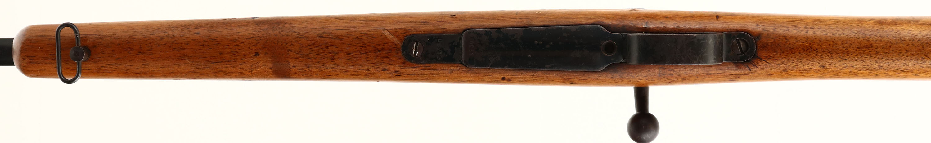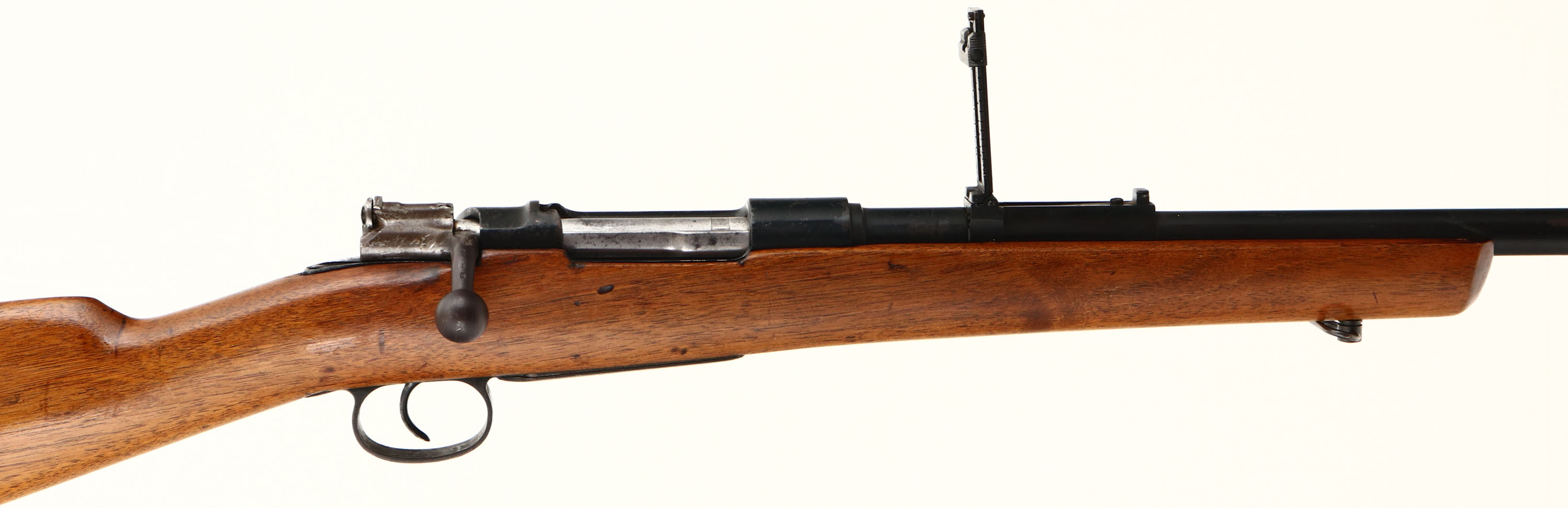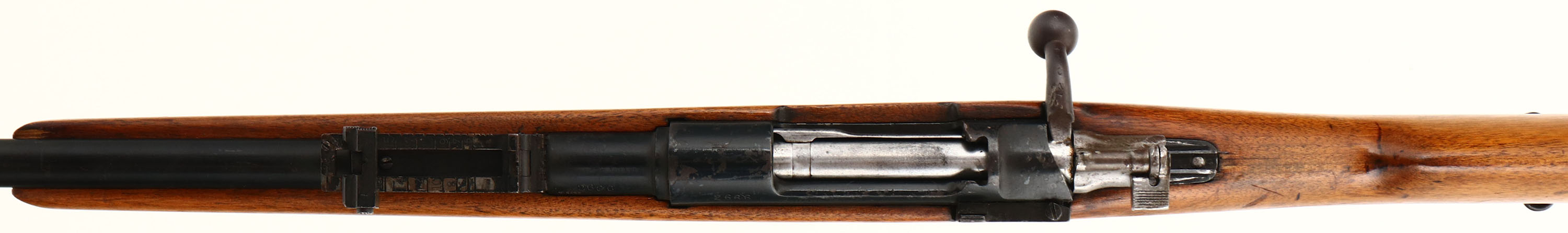 Spanish Mauser. Model 1893. Cal: 7x57mm. MFG: 1896-1943. S/N: 2666. Bolt action rifle. 22'' Barrel. The straight wrist wooden stock is good, stock has been cut down, holes drilled in stock on left side by magazine, small chip at toe, stock has scratches, dents, gouges & wear from use. The Metal has been Re-finished with a black paint, paint has worn away in spots to show original finish underneath. Left side of receiver is marked with S/N, ''MAUSER ESPANOL MODELO 1893'', Left side of barrel is marked with S/N, ''7MM''. Bore is good, roughness with thinned rifling. No Front sight, V-notch ladder rear sight marked 4 to 20. Metal buttplate with wear & brown patina. Bottom sling swivels. FFL Or C&R Req - Value: 100 to 200