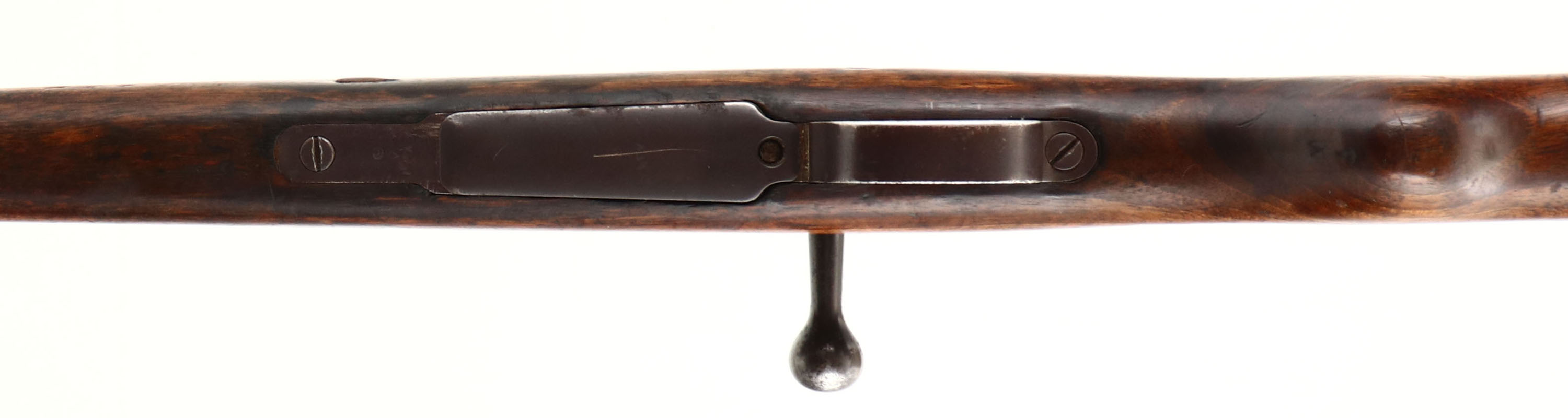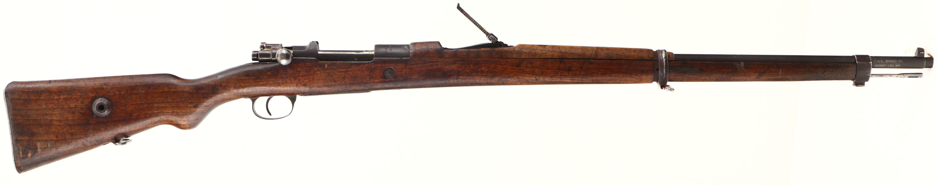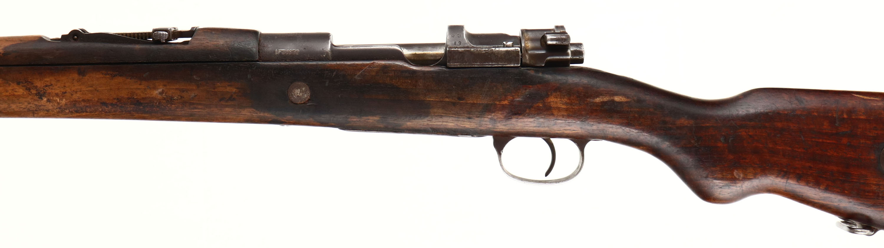 Asfa Ankara. Model: 1893/38. Cal: 7.92x57mm. MFG: 1898. S/N: 35832. Bolt action rifle. 29'' Barrel. The semi pistol grip wooden stock is very good with scratches, gouges, dents, oil darkening & wear from use/age, Bolt disassembly disc in stock. The metal finish rates 30% with pitting at stock line, pitting on metal parts & brown patina. Left side of receiver is marked with importer marks, ''T C'', ''AS FA'', ''ANK ARA'', ''1898'', Crescent Moon/Stars, S/N, end of barrel is marked with importer marks. Bore is very good, slight darkening & light roughness with crisp rifling. Barleycorn front sight, V-notch tangent rear sight marked 1 to 20. Metal buttplate with wear & brown patina. Bottom sling swivels, has cleaning rod. This Rifle started its life as a ottoman 1893 Mauser chambered in 7.65x53mm, some time in the 1930's it was refurbished at a factory to conform to what would be the m38 pattern, rechambered into 8mm Mauser & Gew 98 style bolt was fitted. Antique No FFL Req. - Value: 200 to 400
