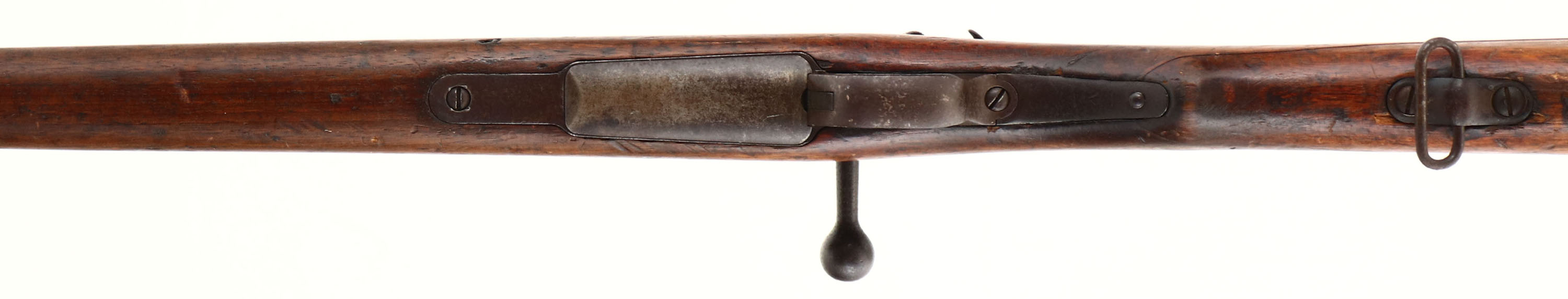 Tokyo Arsenal. Model: Type 30. Cal: 6.5 Jap. MFG: 1897-1906. S/N: 52146. Bolt Action Rifle. 30 1/4'' Barrel. The semi pistol grip wood stock is very good with Factory stock repair at joint of two piece stock on left side, crack down whole top if upper handguard, scratches, chips, dents, gouges & wear from use/age, cartouche on right side of stock ''96''. The metal finish rates 90% overall with light patina speckling. Left side of receiver is marked with S/N, arsenal stamp, top of receiver is marked with chrysanthemum that has stamp over top of it & ''Type 30'' In Japanese, S/N mismatched bolt. Bore is good, dark with roughness but has crisp rifling. Barleycorn front sight, V-notch Ladder rear sight marked 4 to 20. Metal buttplate with brown patina, & plate is slightly proud to the wood at toe. Bottom sling swivels, Cleaning rod. A nice and rare piece being the first ever Arisaka rifle this would make a nice piece to any Military collection. FFL Or C&R Req. - Value: 300 to 900