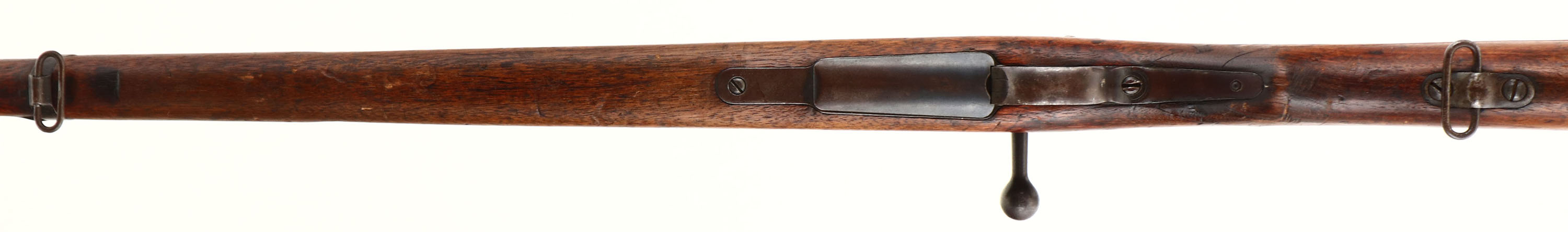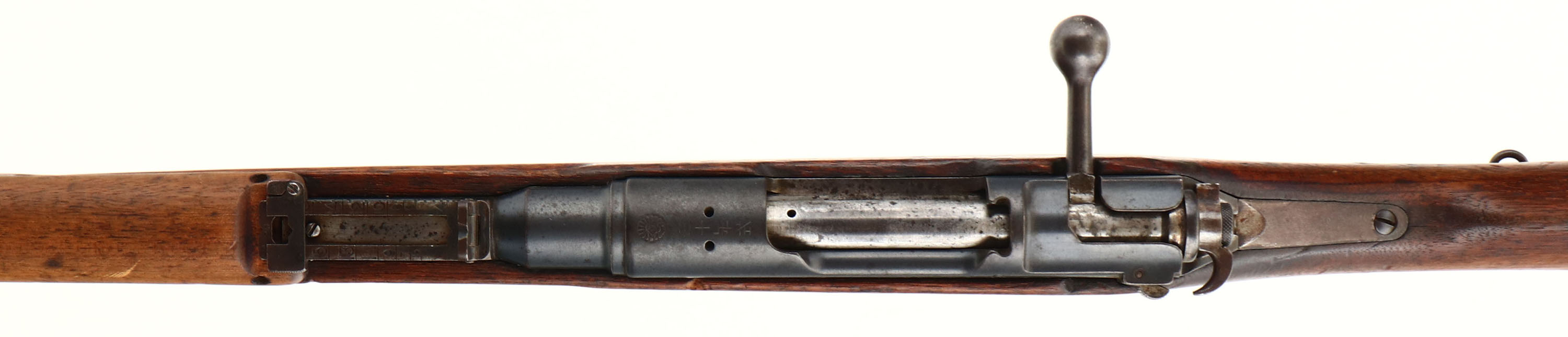 Tokyo Arsenal. Model: Type 30. Cal: 6.5 Jap. MFG: 1897-1906. S/N: 319387. Bolt Action Rifle. 30 1/4'' Barrel. The semi pistol grip wood stock is very good with Factory Crack repairs/reinforcement on both sides at wrist of stock, scratches, chips, dents, gouges & wear from use/age, cartouche on right side of stock that's Japanese lettering in box. The metal finish rates 95% overall. Left side of receiver is marked with S/N, arsenal stamp, top of receiver is marked with chrysanthemum that has stamp over top of it & ''Type 30'' In Japanese, S/N mismatched bolt. Bore is very good, light roughness & light darkening with sharp rifling. Front Barleycorn sight, V-notch Ladder rear sight marked 4 to 20. Metal buttplate with brown patina, missing lower screw & plate is proud to the wood at toe. Bottom sling swivels, missing cleaning rod. A nice and rare piece being the first ever Arisaka rifle this would make a nice piece to any military collection. FFL Or C&R Req. - Value: 300 to 900