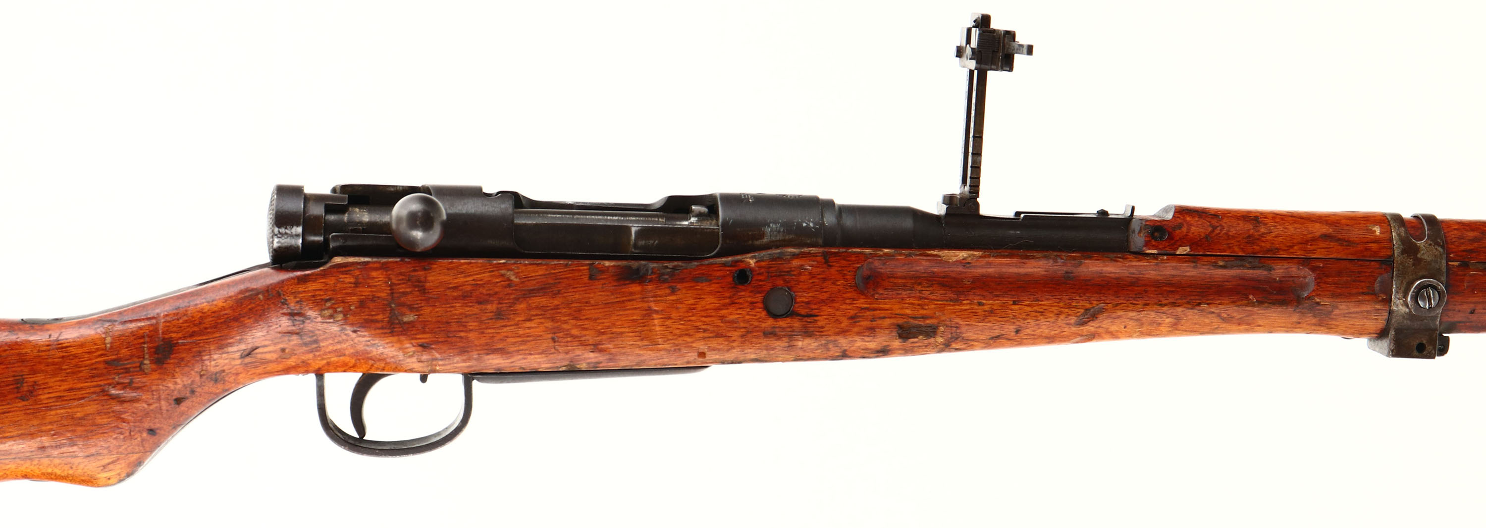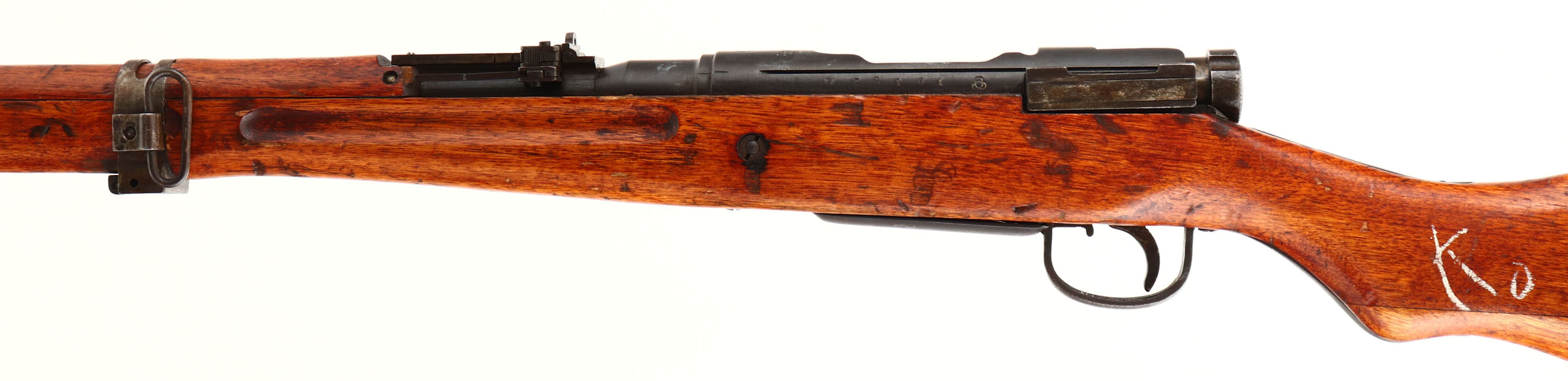 Kokura Arsenal. Model: Type 99. Cal: 7.7 Jap. MFG: 1939-1945. S/N: 22101. Bolt Action Rifle. 25'' Barrel. The semi pistol grip wood stock is very good with scratches, chips, dents, gouges & wear from use/age. The metal finish rates 90% overall with small spots worn to a gun metal gray, inside of magazine box, follower & spring all have surface rust. Left side of receiver is marked with S/N, arsenal stamp, top of receiver is marked with Intact chrysanthemum & ''Type 99'' In Japanese, S/N matched with bolt. Bore is very good, bright & shiny with thinning rifling. Barleycorn front sight with protective ears, Aperture Ladder rear sight marked 3 to 15, Has folding anti-aircraft sight wings & are marked 2 to 3. Metal buttplate with wear & brown patina. Side sling swivels & cleaning rod. This is a really nice example of a early type 99. FFL Or C&R Req. - Value: 250 to 500