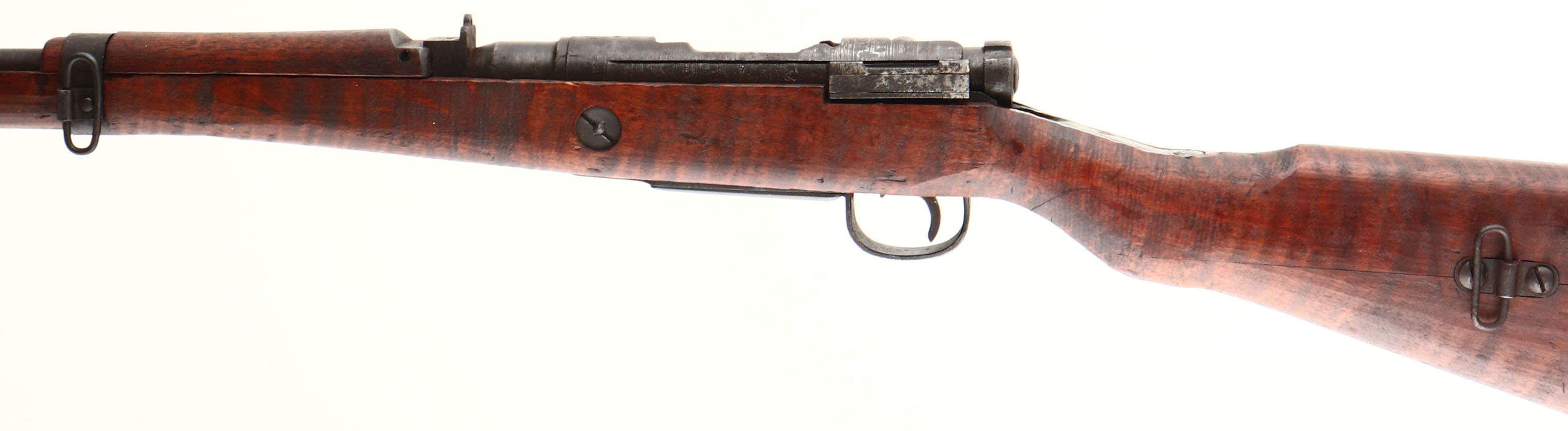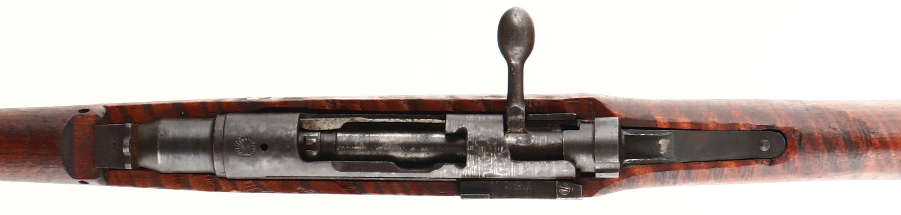 Kokura Arsenal. Model: Type 99. Cal: 7.7 Jap. MFG: 1939-1945. S/N: 65576. Bolt Action Rifle. 25'' Barrel. The semi pistol grip wood stock is very good with scratches, dents, gouges & wear from use/age. The metal finish rates 60% overall with spots of patina & gray. Left side of receiver is marked with S/N, arsenal stamp, top of receiver is marked with Intact chrysanthemum, S/N matched with bolt. Bore is very good with some light roughness in spots, bright with crisp rifling. Barleycorn front sight, fixed aperture rear sight. Wooden buttplate held in with three nails. Side sling swivels. This is a perfect example of a last ditch type 99 with the Rare Intact chrysanthemum! FFL Or C&R Req. - Value: 150 to 300