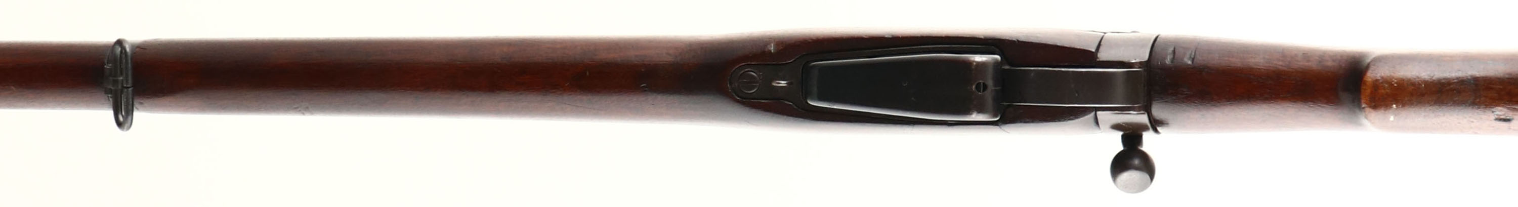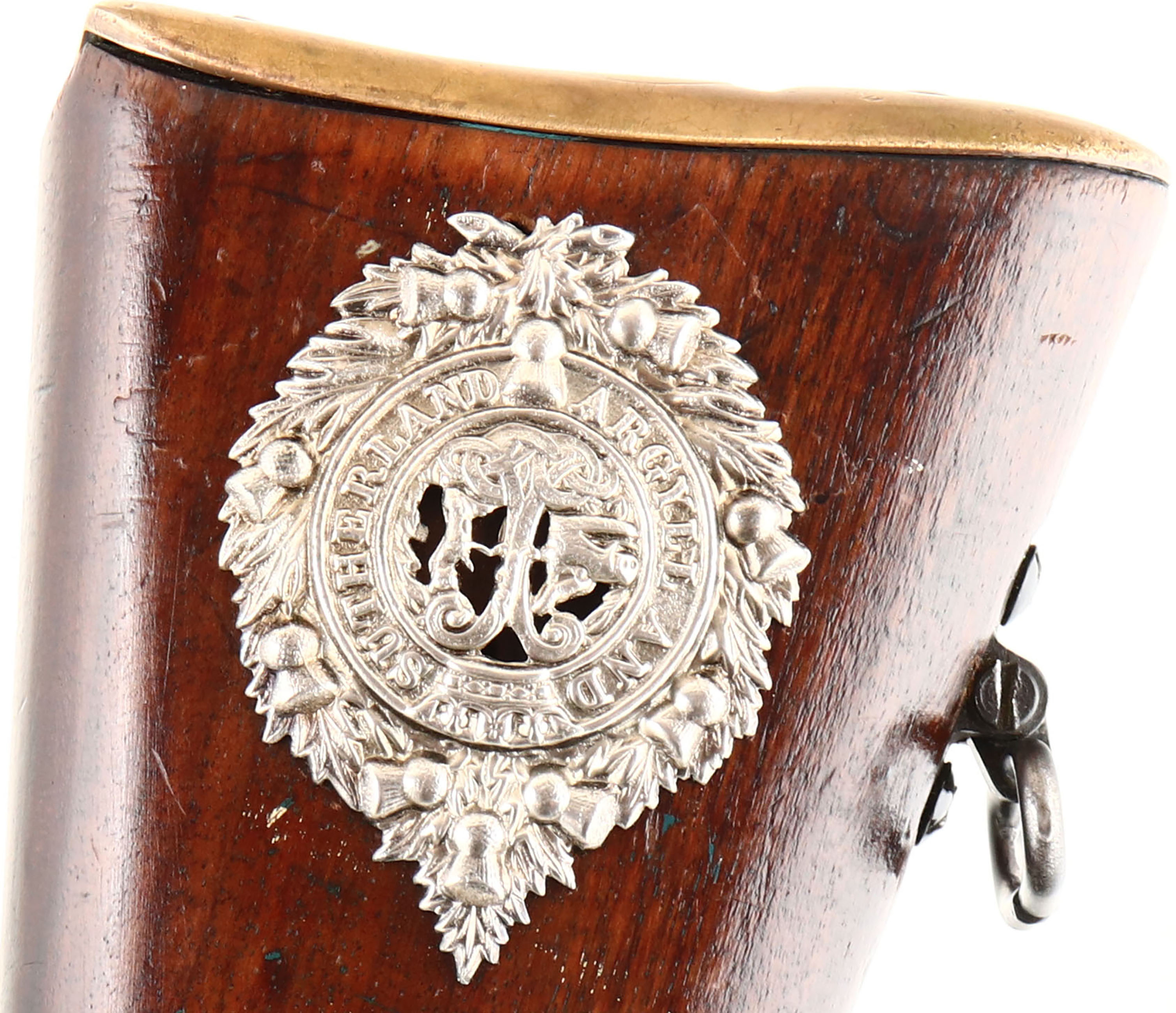 England. Model: No4 Mk1. Cal: .303 British. MFG: 1942. S/N: U6994, Bolt action Rifle, 23 1/2'' Barrel, The semi pistol grip wood stock is very good, it appears to have been lightly sanded & refinished, stock has light scratches & dents, Stock repair on right side of stock by magazine, Argyll & Sutherland Highlanders Cap Badge embedded into left side of stock, The metal finish rates 85 % overall with spots of normal wear, left side of wrist band marked ''2'', ''1942'', S/N, Receiver is marked ''ENGLAND'', S/N Matched Bolt. Bore is excellent. Blade front sight & two position aperture rear sight that is marked 2 to 13. Brass Trapdoor buttplate with no cleaning, front & rear sling swivels, front of barrel has been cut down past the bayonet lugs. FFL Or C&R Req. - Value: 200 to 400
