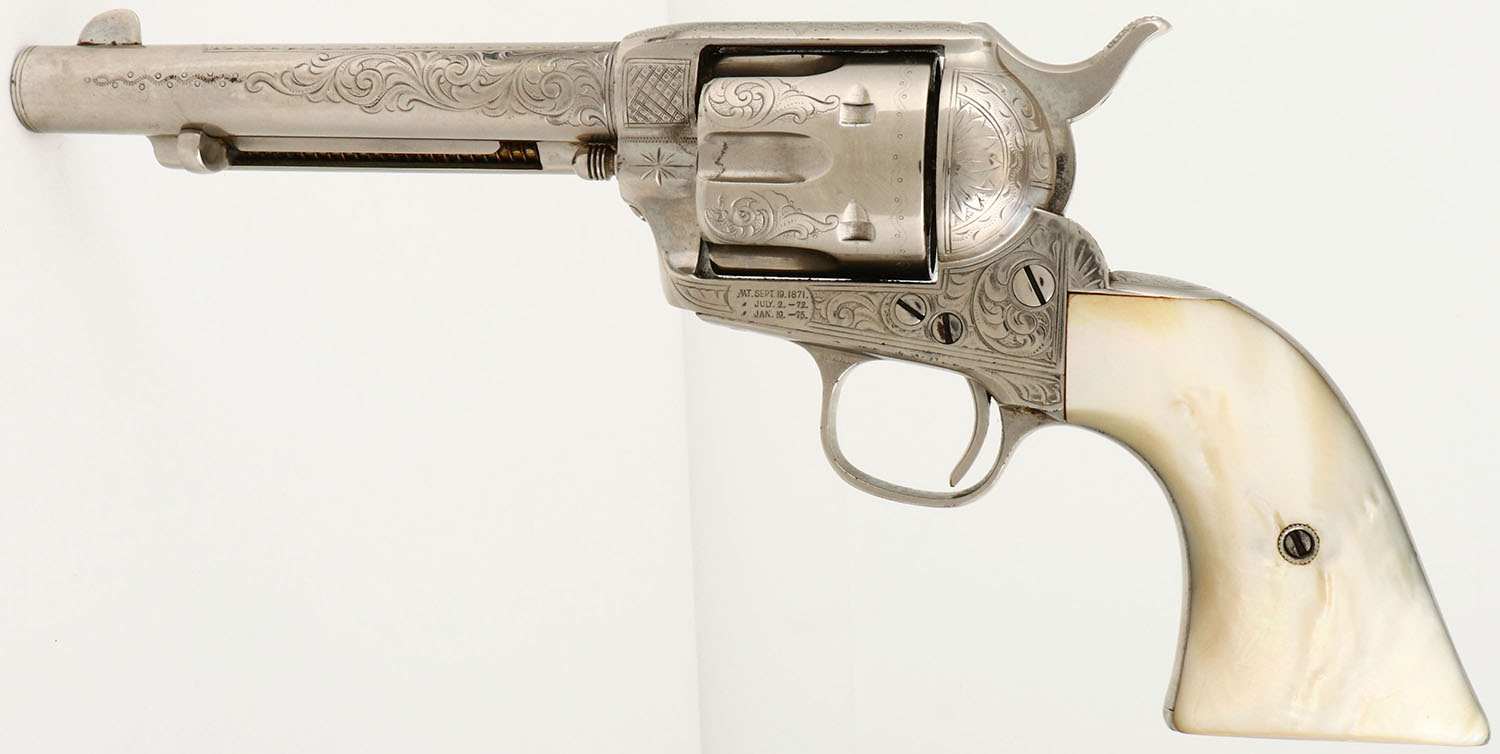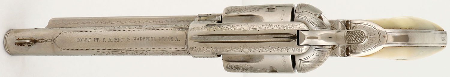 OUTSTANDING Colt, SAA, CAL: 45, MFG: 1882, SN: 82530, Single Action Revolver, 5 1/2'' barrel. This revolver is beautifully factory hand engraved. with scroll, vine & ornamental work on the frame, cylinder, barrel, barrel housing, trigger guard, backstrap & butt. The authentic Mother of Pearl grips are very good, with minor edge chips on the corners & a surface layer edge chip on the bottom of the right grip that has smoothed over time & is not distracting. The nickel finish rates 98% overall, with a couple of areas of light spotting & speckling. Bore is excellent & bright. The barrel holds a blade front sight & the frame has an integrated groove rear notch. This revolver comes with a copy of a Colt Factory letter, confirming the configuration & dates. This is a truly outstanding example of a factory nickeled & factory engraved Colt SAA.* Antique, No FFL Req. - Value: 12000 to 18000