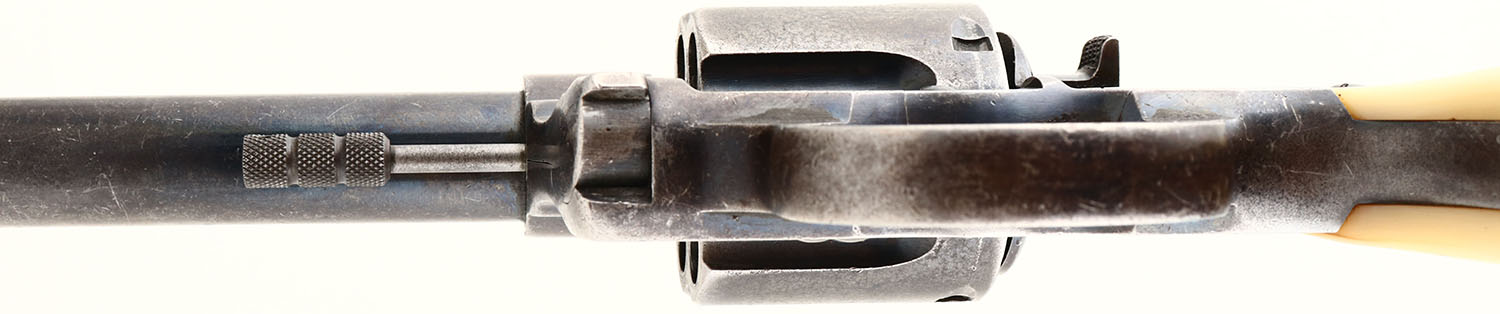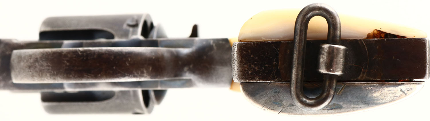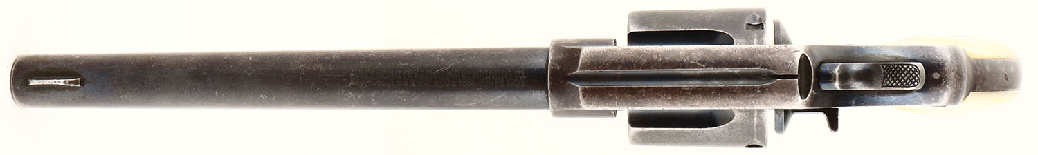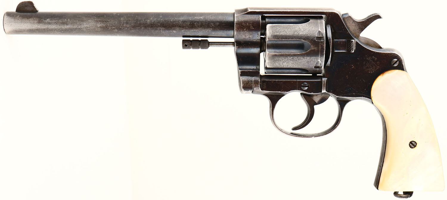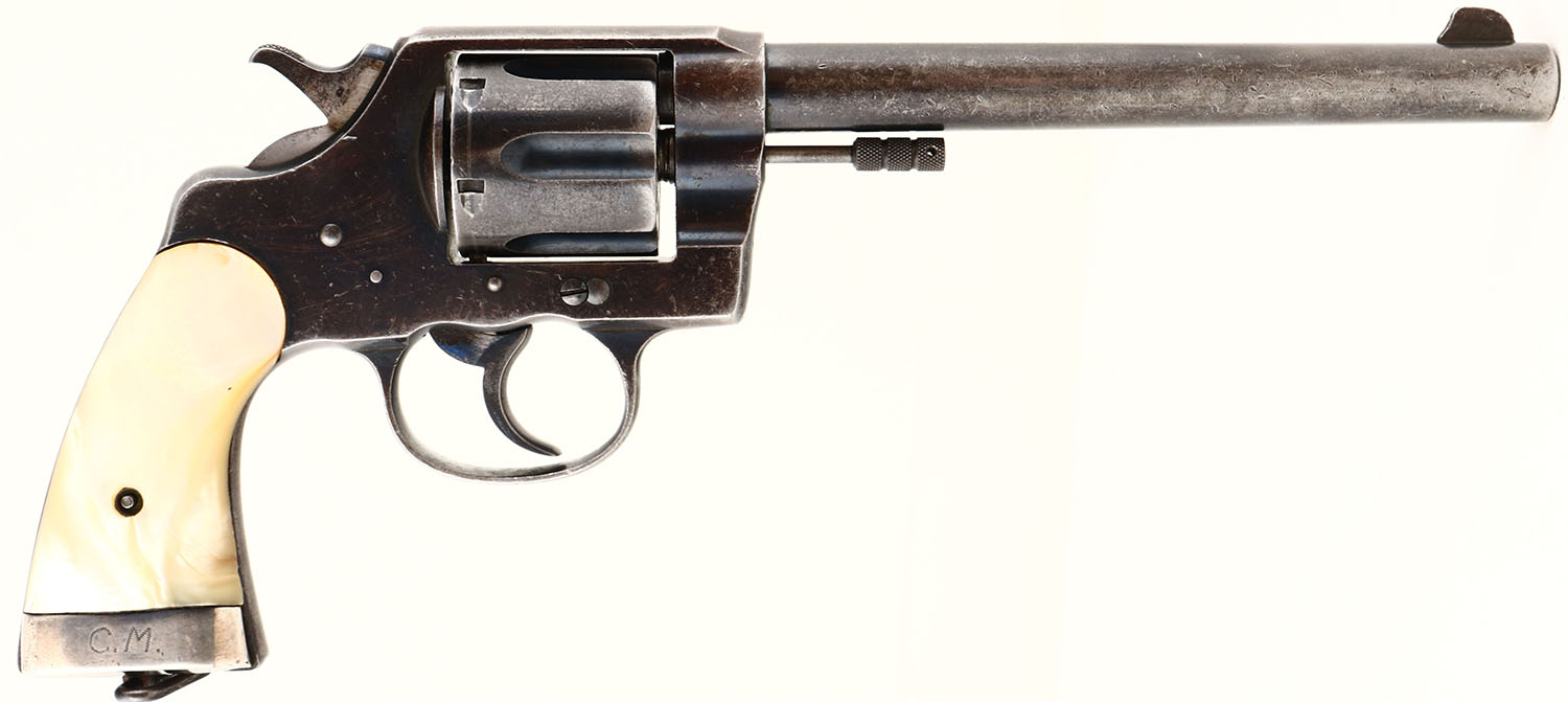 Colt, New Service, CAL: 38 WCF, MFG: 1907, SN: 18959, Double Action Revolver, 7 1/2'' barrel. The mother of pearl grips are excellent, with wonderful color & fire, also a couple of small edge flakings at the top of the left grip & a small missing chip on the underside bottom edge. The silver bolster at the bottom of the right grip carries the engraved initials ''CM''. The original metal blue finish on the barrel rates 40% of a thinning blue & 50% thinning blue on the frame/cylinder, with areas of loss toning to brown patina & worn gun metal gray. The metal surfaces display light nicks & dings. Bore is very good. The barrel holds a blade front sight. Butt carries a lanyard swivel. Action & cylinder are tight & appear to function properly. FFL or C&R Req. - Value: 400 to 800