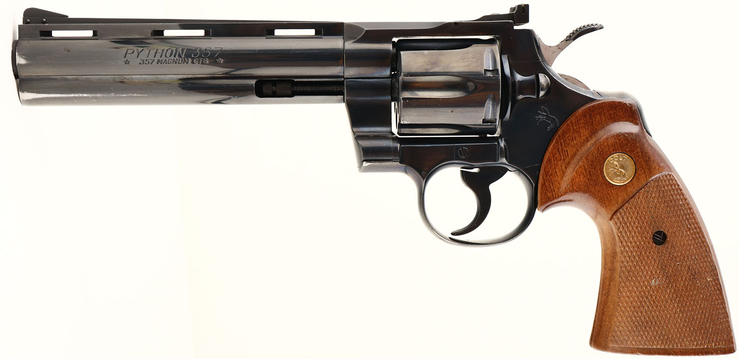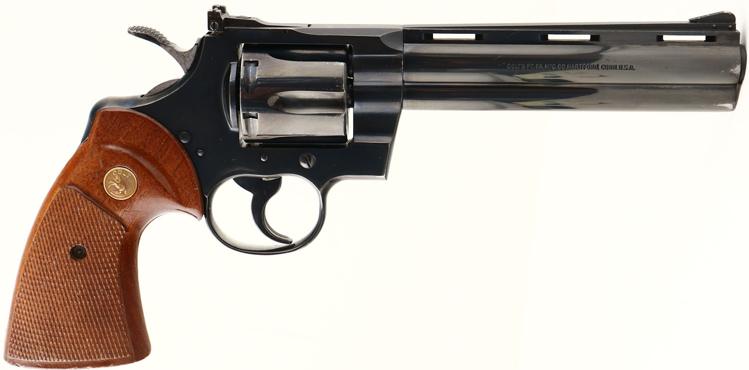 Colt, Python, CAL: 357, MFG: 1975, SN: E94621, Double Action Revolver, 6'' barrel. The original Rampant Colt medallion checkered wood grips are excellent, displaying minor dings & handling marks. The metal blue finish rates 97% overall, with loss due to holster wear near the muzzle & other small scuffs. Bore is excellent, with very light wear from honest use. The ventilated rib holds a blade front sight & the frame holds an adjustable rear sight. A highly desirable revolver. FFL Req. - Value: 2000 to 3000
