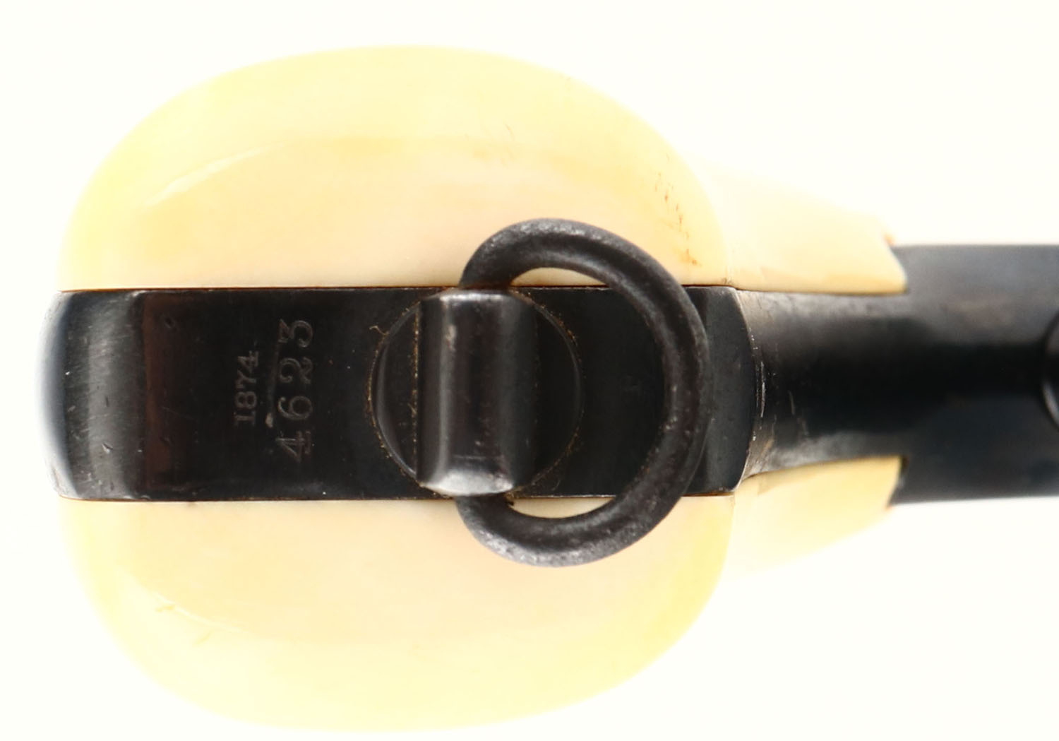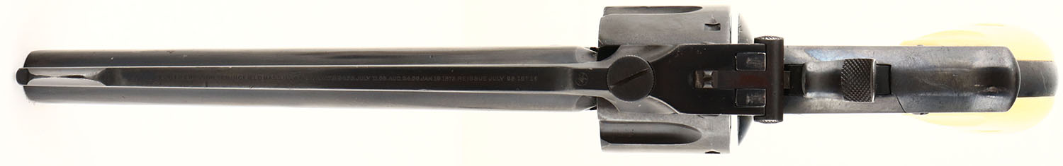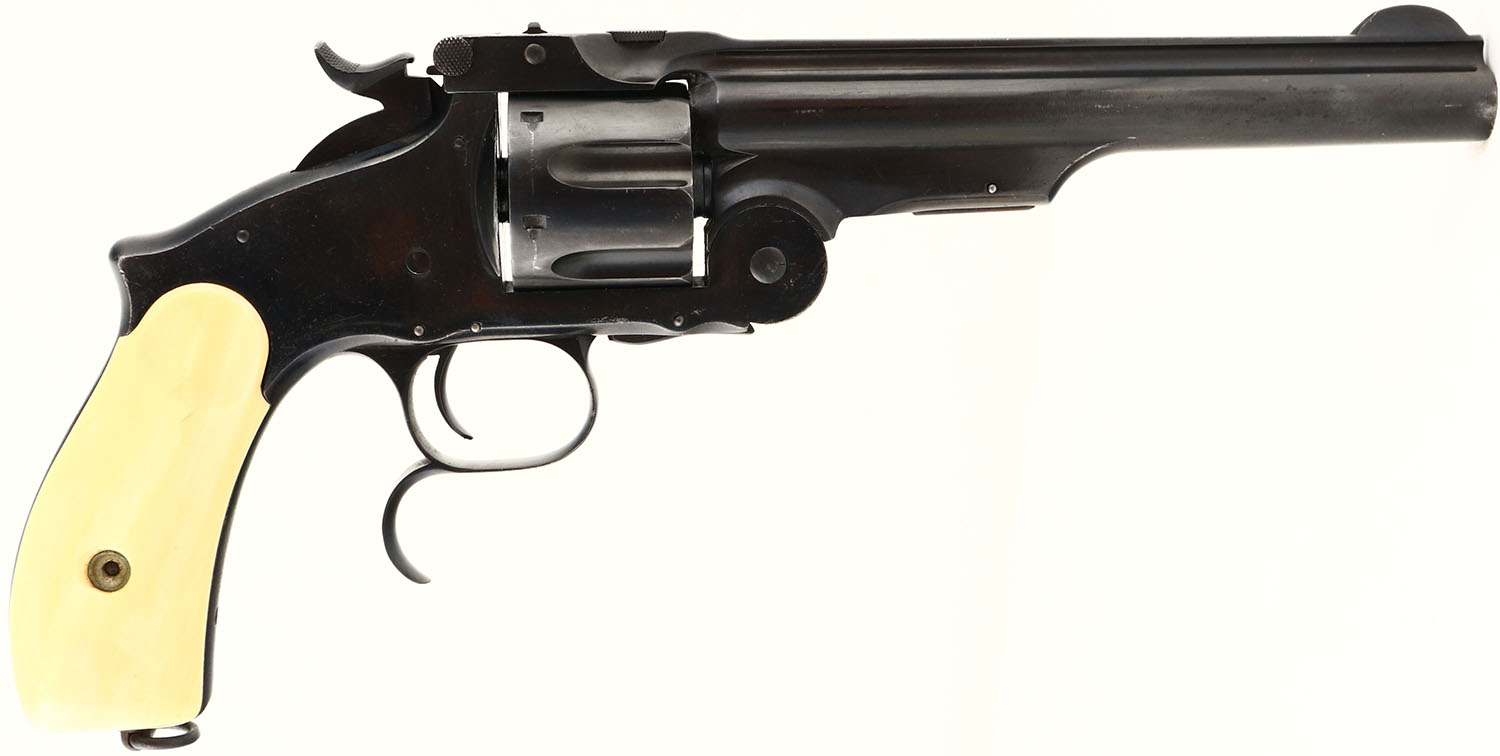 Smith & Wesson, 1874 3rd Model, Old model Russian, Cal. 44 Russian; MFG: 1874-78, SN: 4623, Single Action Revolver, 6 1/2'' barrel, air bore, good grips, 6.25'' barrel, Faux Ivory grips are excellent, with very nice coloring to match aged ivory. The metal finsh is an older aged professional reblue, retained at 95% & showing some scratches & pitting under the current blue. Bore is excellent, with some haze & speckling at the muzzle amongst strong rifling. The buttstrap stamped with 1874 above SN. The characteristics of the 3rd model are the trigger spur, large screw on top strap & a front sight forged into the barrel. Though refinished, this 3rd model Russian revolver is quite collectible & presents well. Antique, No FFL Req. - Value: 1000 to 2000