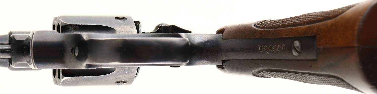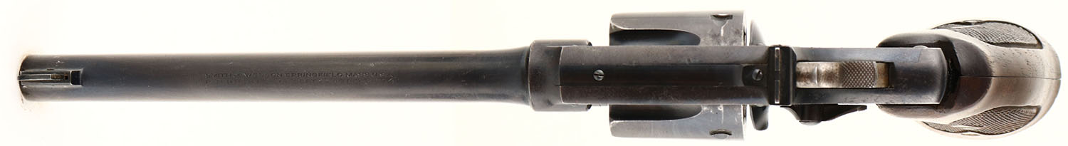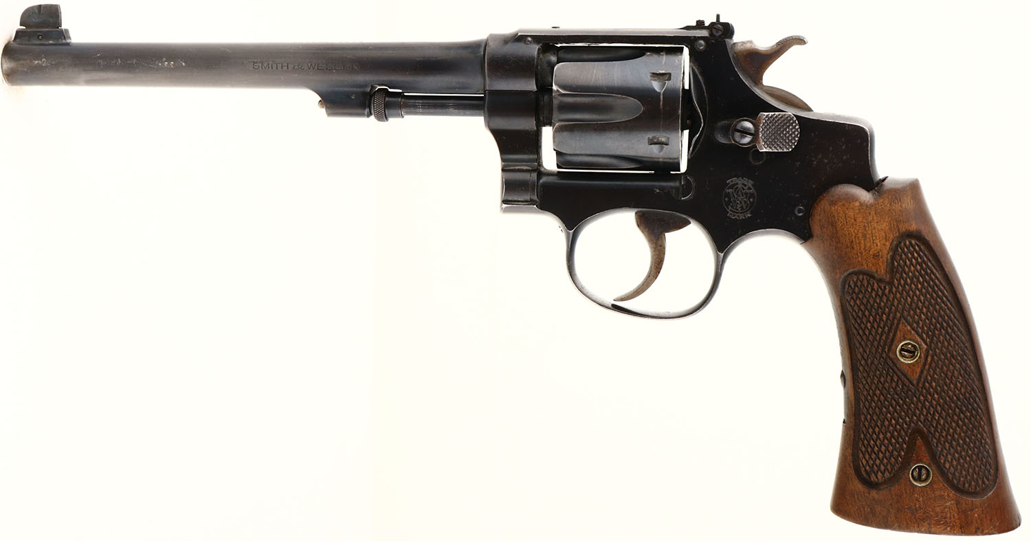 Smith & Wesson, Model 22/32 Hand Ejector, .22 LR Cal., Double Action Revolver, Mfg. 1911-41, SN: 472023, 6'' barrel, Original wood checkered grips are very good, with minor edge nicks & several small contusions on the bottom where it was used as a light hammer. The original high polish metal blue finish is 85%, with minor wear marks & spoeckling. The case-colors on the hammer & trigger are muted. Bore is very good. Comes with unmarked early leather holster. FFL & C&R Req - Value: 400 to 800