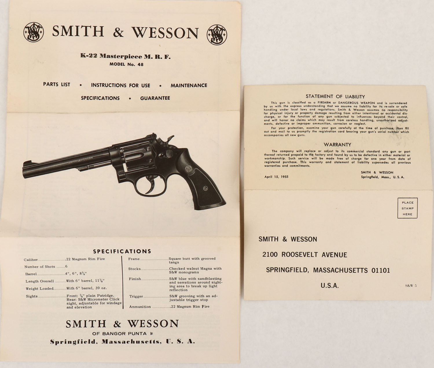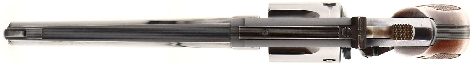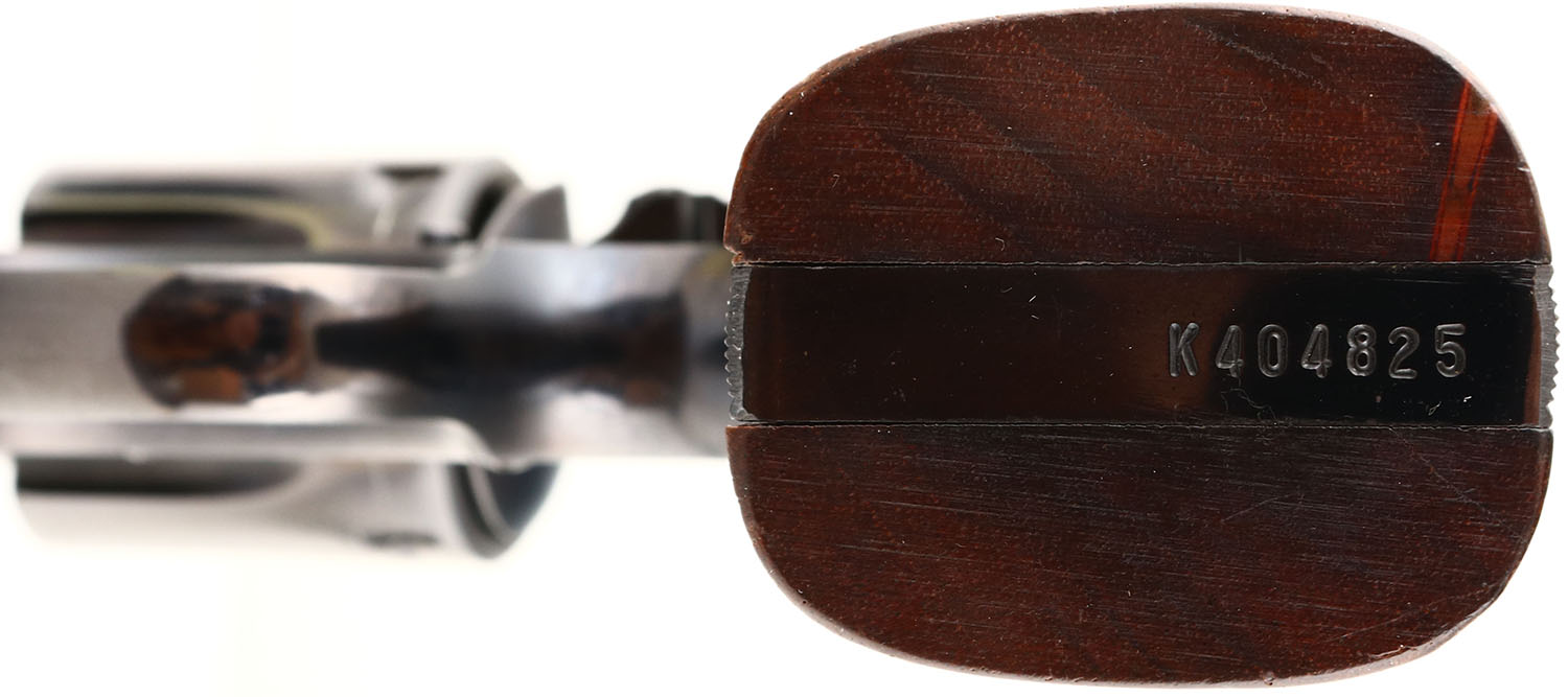 BOXED, Smith & Wesson, Model 48 (1st Variations), CAL: .22 MRF (WMR), Double Action Revolver, MFG: 1959, SN: K404825, 6'' barrel, The original checkered grips are excellent. The original high gloss metal finish is 98%. Case-hardened hammer & trigger, strong colors. Adjustable rear & ramp front sights. Bore is excellent. Comes in original SN matching box, with original paperwoork & wax paper. FFL or C&R Req. - Value: 600 to 1200