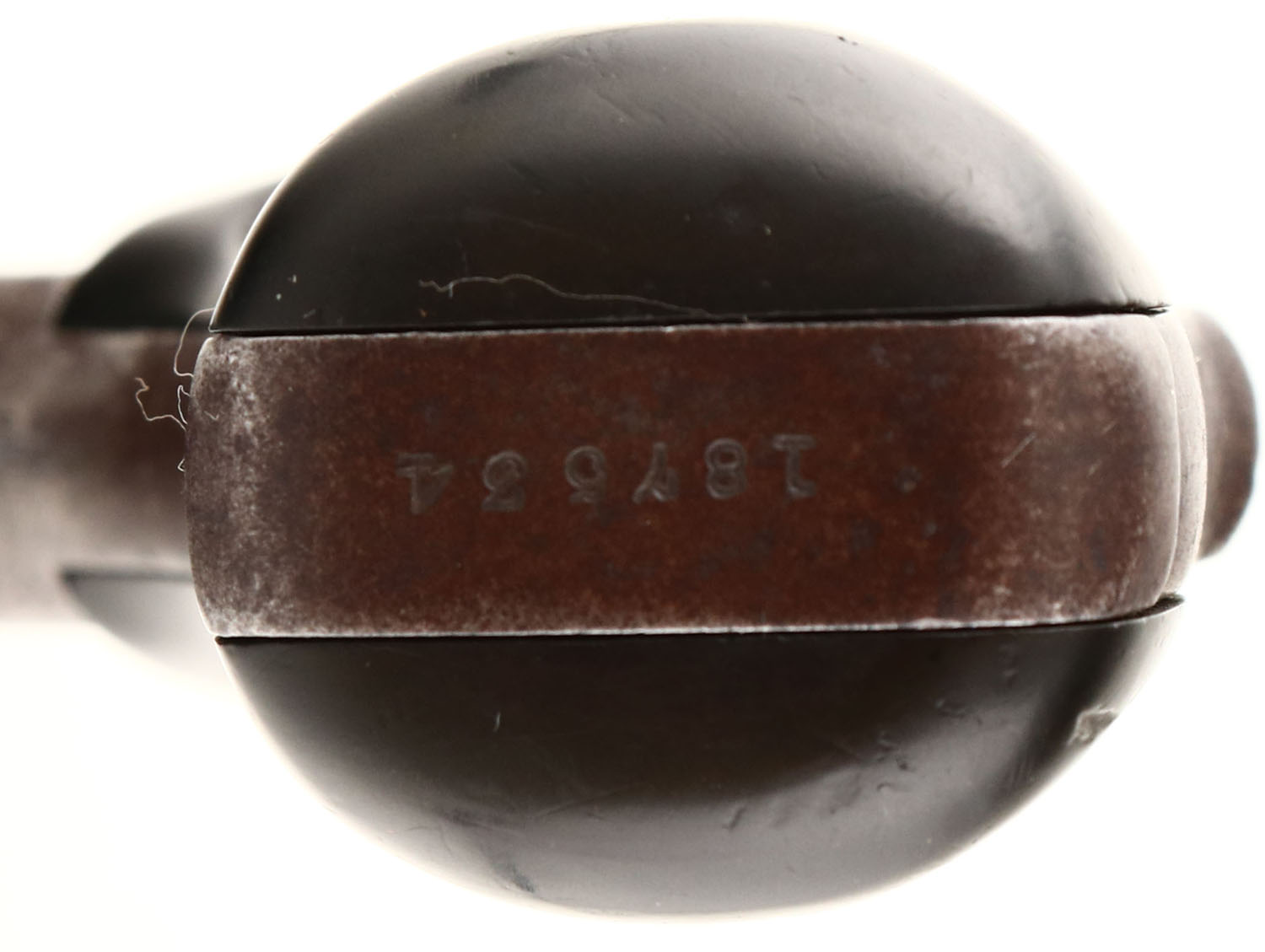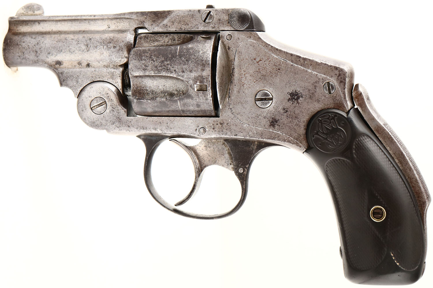 Smith & Wesson, Model Safety Hammerless 4th model (Lemon Squeezer), .38 S&W Cal., Double Action Revolver, Mfg. 1898-1907, SN: 187534, Rare Special Order 2'' barrel, Comes with an additional 4'' barrel & cylinder. Original checkered hard rubber grips are very good, but with worn checkering, mostly smooth on right side. Metal finish is worn gun metal gray, with some brown patina & spotty areas of cleaned rust pitting. Bores are good. Integrated rear & blade front sight. FFL & C&R Req. - Value: 200 to 400