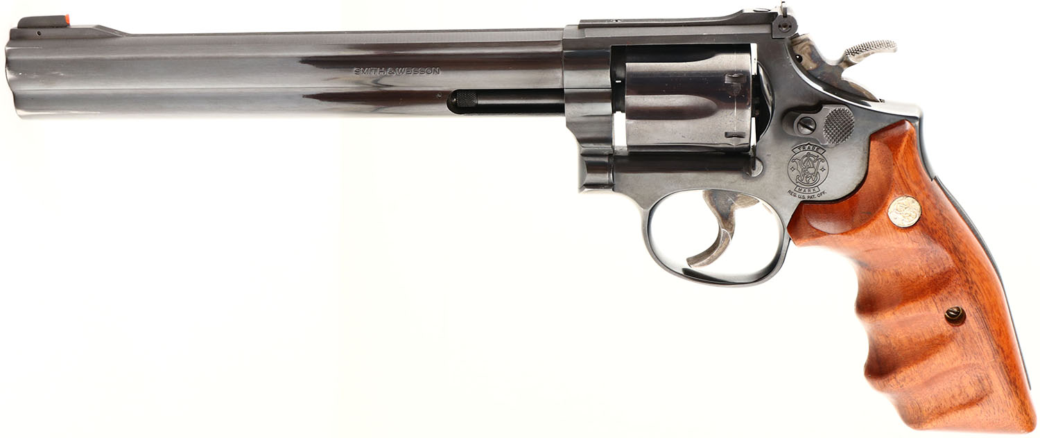 BOXED, S&W, Model 16-4, N-Frame, .32 Magnum, Double Action Revolver, Mfg. 1989-92, SN: BFE5934, 6'' barrel, The original wood grips are excellent, The original blue finish is 99% with a light drag line on cylinder, The case-hardened hammer & trigger have their full vivid case-colors. Mechanically mint/excellent. Bore is mint, Excellent original blue & white matching box, has paperwork & original wrapping paper. Very collectible blued finish Model 16-4. FFL Req. - Value: 1000 to 3000