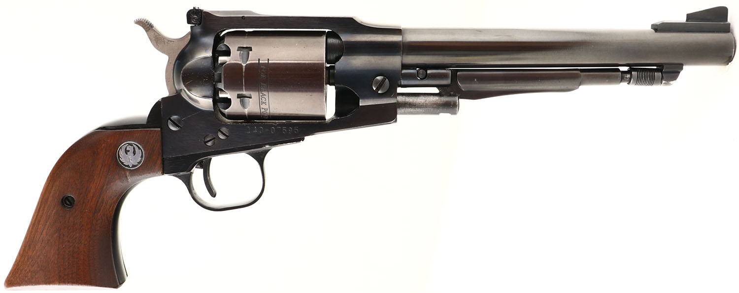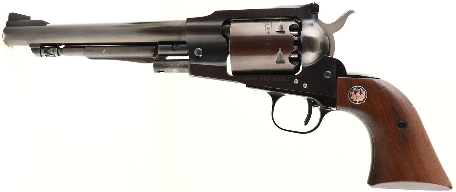 Ruger, Old Army, CAL: 44 (.457 Ball Diameter), MFG: 1974, SN: 140-07595, Single Action Black Powder Revolver, 7 1/2'' barrel. The Ruger logo medallion wood grips are excellent. The polished blue finish is 95%, Bore is excellent, with sharp rifling. The frame has an adjustable rear sight & the barrel holds an elevated blade front sight, Black Powder, No FFL Req. - Value: 500 to 1000
