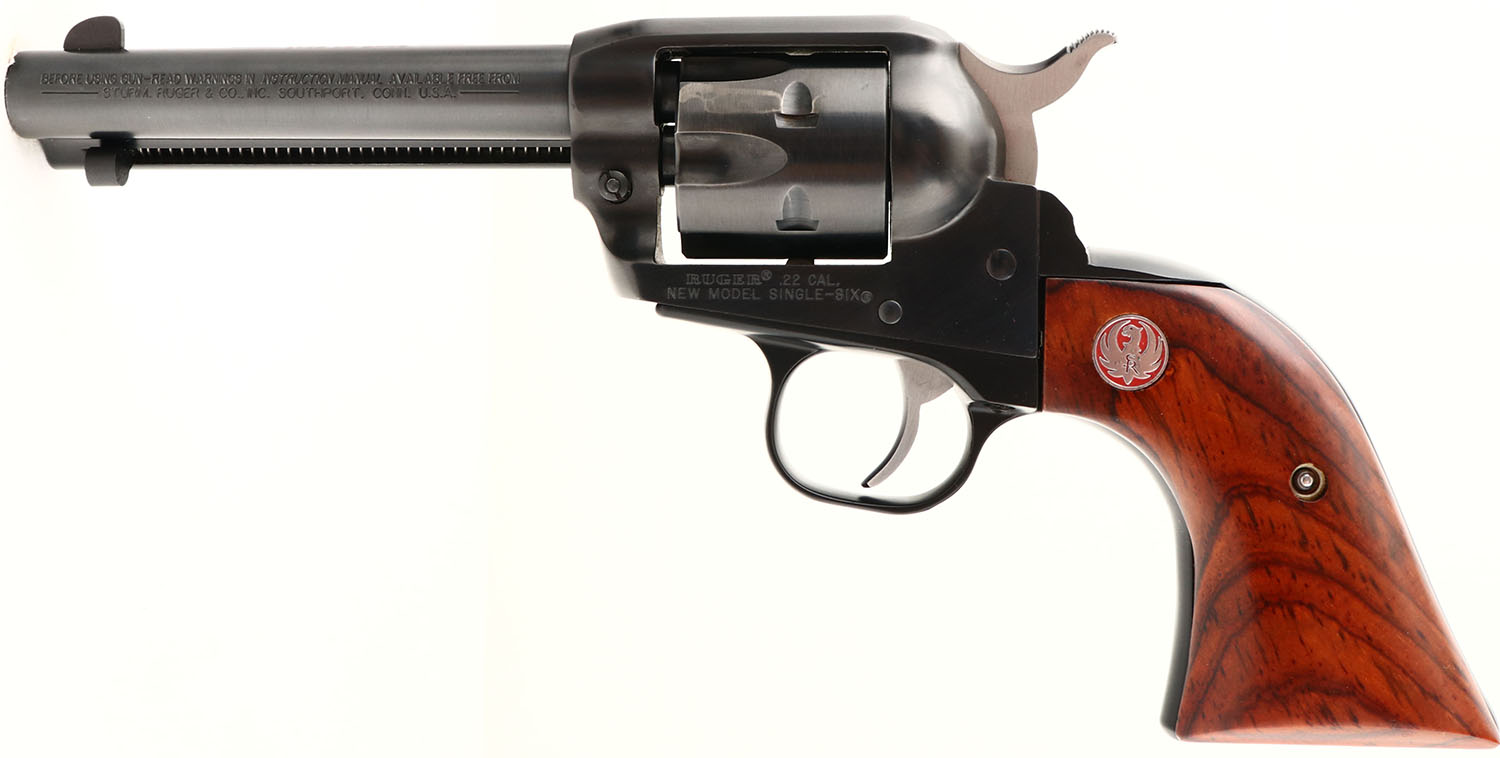CASED, Ruger New Model Single Six, CAL: 22LR/22 MAG, MFG: 2002, SN: 268-26610, Single Action Revolver, 4 1/2'' barrel. The original wood medallion grips are near mint, The metal blue finish rates 98% overall, with one small mark to right side of receiver. Bore is excellent. Comes in original red box, with paperwork & extra cylinder. FFL Req - Value: 400 to 800