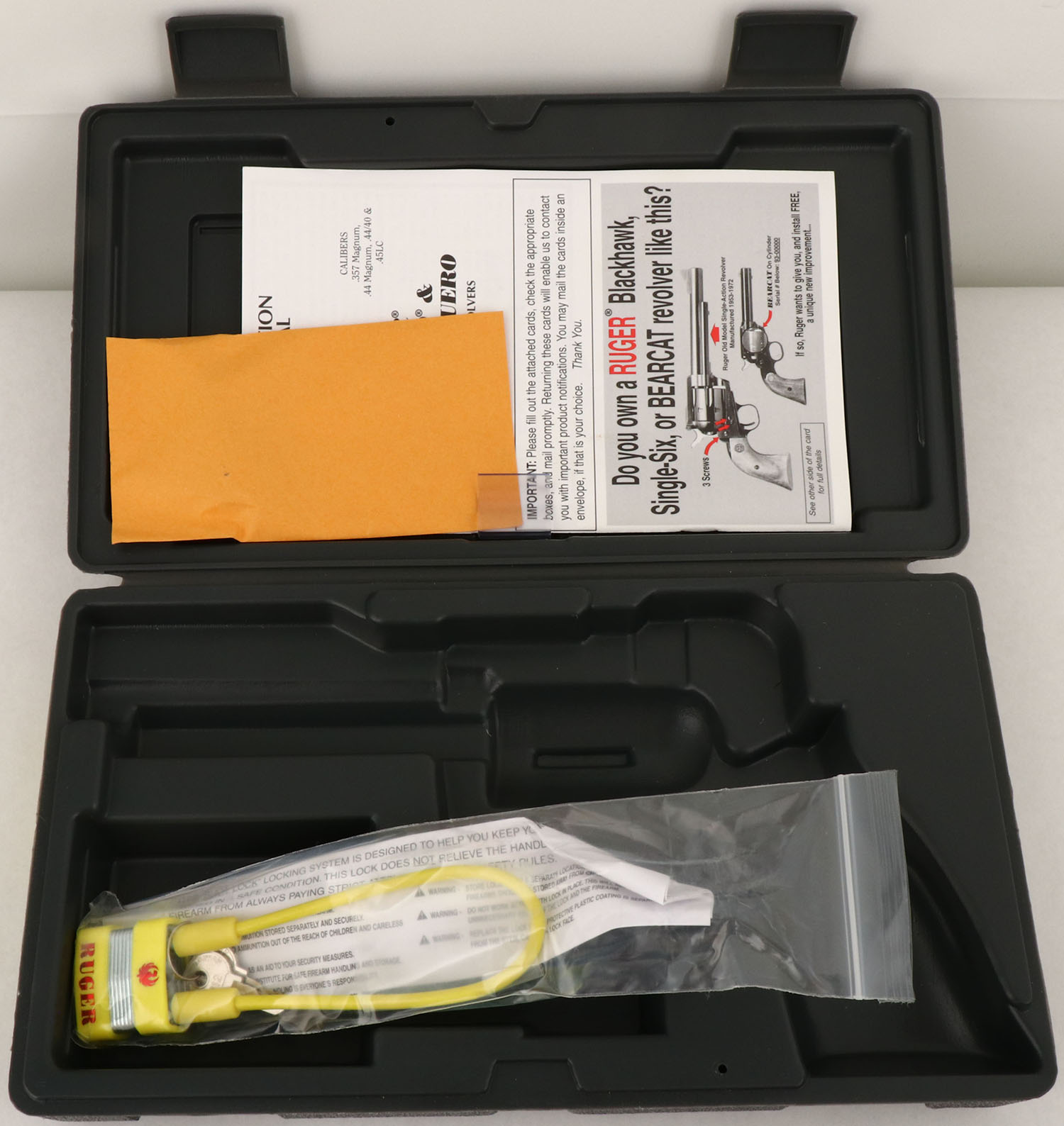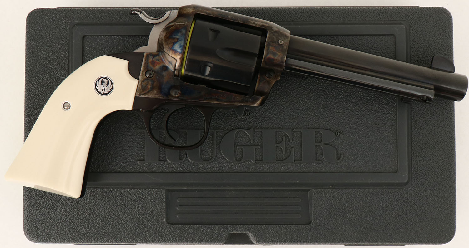 CASED Ruger Model ''Vaquero'', CAL: 45, MFG: 2003, SN: 58-18728, Single Action Revolver, 5 1/2'' barrel. The faux ivory grips with medallion Ruger logo are mint. The polished blue finish rates 100% overall, with vivid case colors on receiver. Bore is excellent, near mint. Factory sights. Comes with original box with paperwork, lock & spent shell fired at factory, NIB. FFL Req. - Value: 500 to 1000