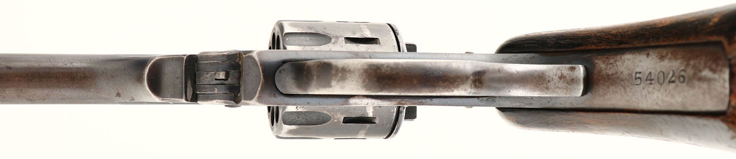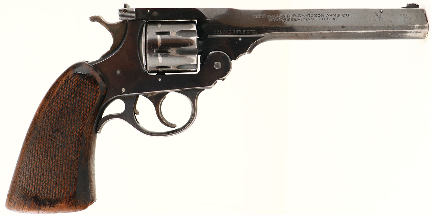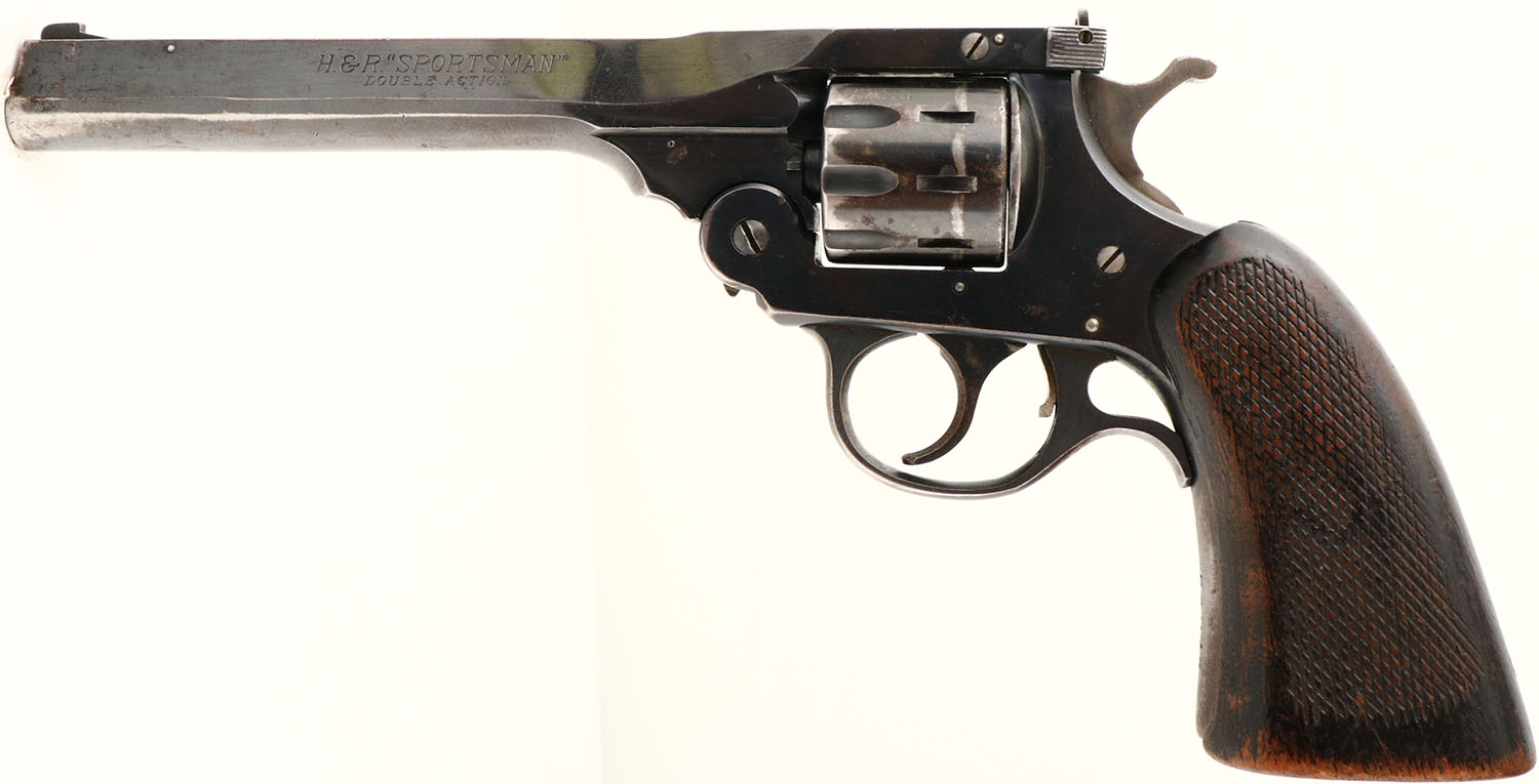 Harrington & Richardson, Model SPORTSMAN (999), 1st model & 1st variation Cal. 22 LR, Double Action Revolver, Mfg. 1932-39, SN: 54026, 6'' barrel, 9 shot, The checkered one piece wood grips good & solid, but with worn black finish & a small chip at the bottom of the front strap. The original metal finish rates 80%, with thinning wearat carry points. Case-colored hammer. Bore is excellent. Appears to function well. Nice early example. FFL or C&R Req. - Value: 200 to 400