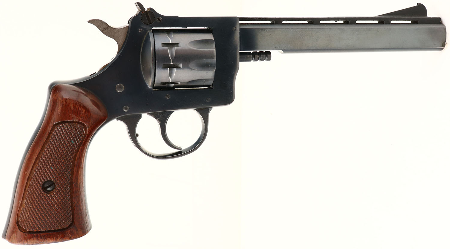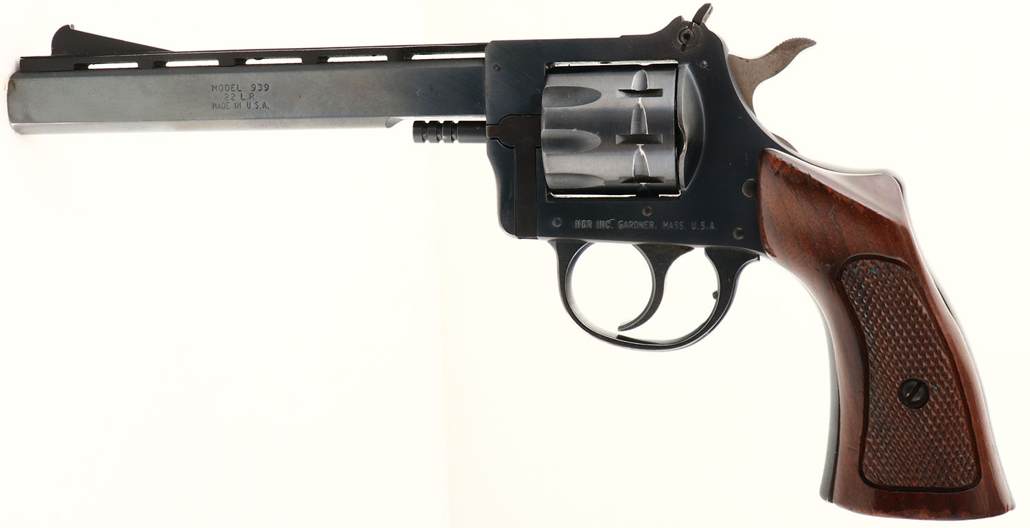 Harrington & Richardson, Model 939, CAL: 22LR, MFG: 1978, SN: AS48923, Double Action Revolver, 6'' barrel. The original checkered wood grips are excellent, with thinning & flaking finish wear due to use & minor handling marks. The original metal blue finish is retained at 97%. The trigger & trigger guard are blued. Silver toned hammer. Bore is excellent. Vented rib, Factory sights. Action & cylinder timing function properly. FFL Req. - Value: 300 to 600