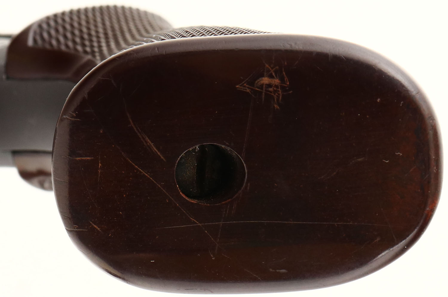 Hi Standard Model Sentinel R-101, marked .22 CAL, MFG: 1940, SN: 674131, Double Action Revolver, 6'' barrel. The checkered, brown plastic grips are excellent. The metal blue finish rates 95% on barrel, while the frame has 70% coverage, with areas of wear causing dullness . Bore is excellent. Factory sights. Action & cylinder timing function correctly. Comes with a fantastic tooled George Lawrence leather holster marked 25B, 5 1/2. FFL or C&R Req. - Value: 200 to 400