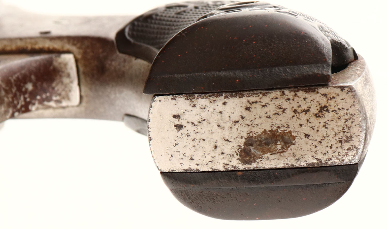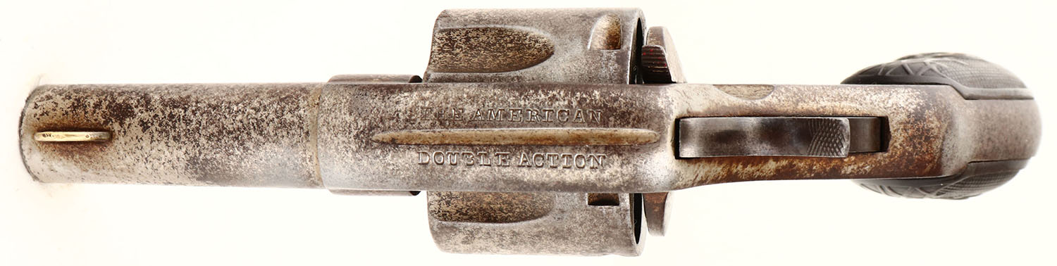 Harrington & Richardson, Model The American Double Action, First Model 2nd Variation, Cal. 44 Webley, Double Action Revolver, Mfg. 1880's-90's, SN: 12, 2 1/2'' barrel, 5 shot, The original checkered hard rubber grips are good, with wear & a missing chip at the bottom back corner of left grip. The metal nickel finish has mostly worn away, with worn areas toned to a brown patina. Bore is fair. Cylinder, trigger & hammer need some adjustment or repair to fully function properly. Antique, No FFL Req. - Value: 50 to 250