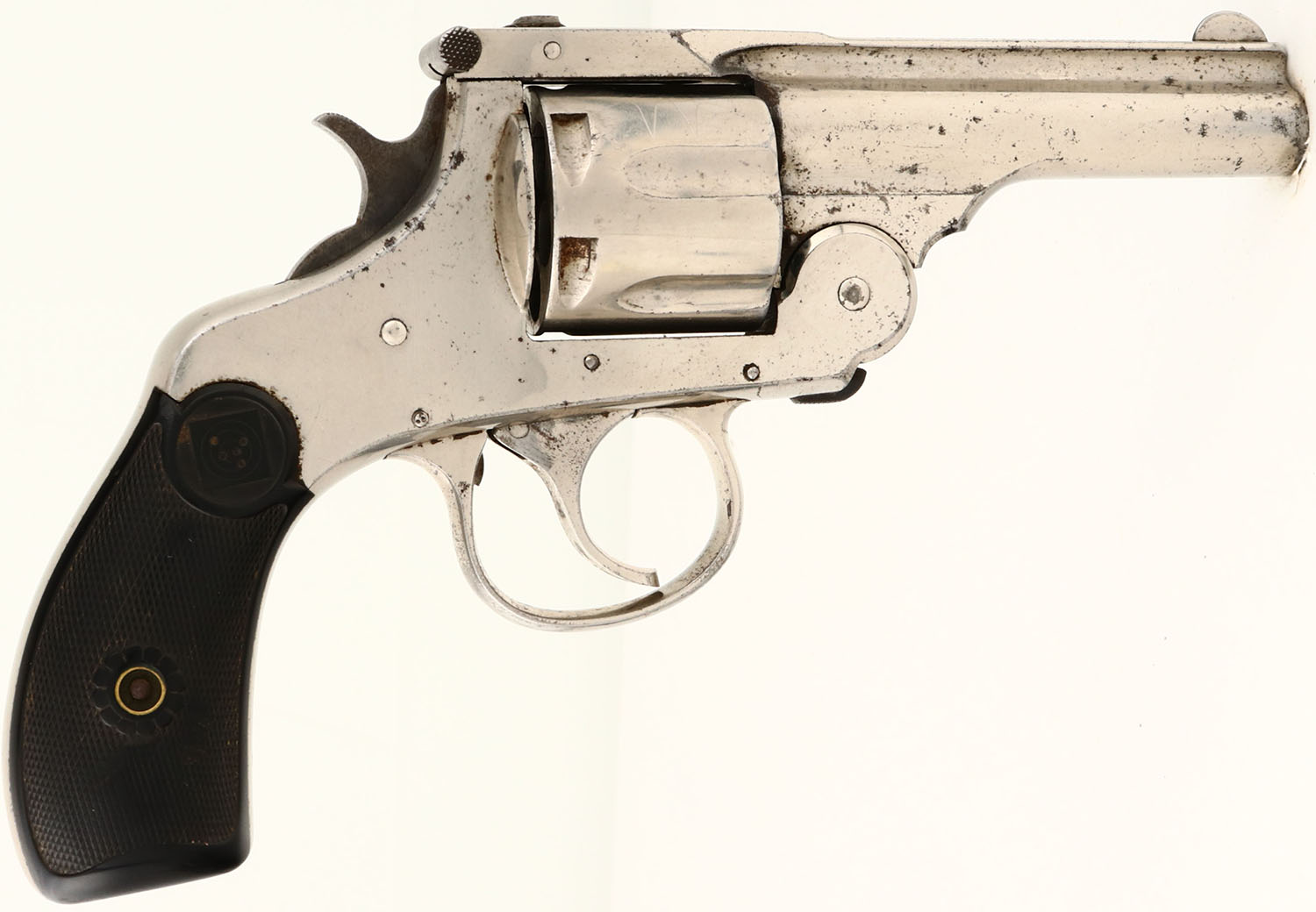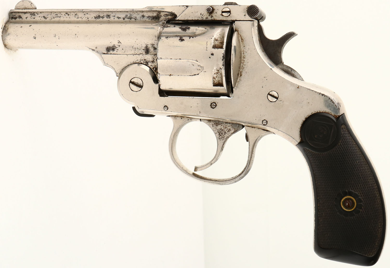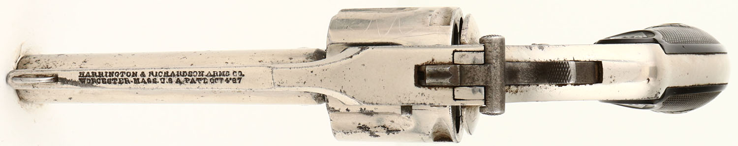 H&R, Top Break Auto Ejecting Model, CAL: 32, MFG: 1890-1898, SN: 5523, Double Action Revolver, 3 1/4'' barrel, 6 shot. The top of the rib is marked ''HARRINGTON & RICHARDSON ARMS COMPANY WORCHESTER, MASS, USA PAT'L OCT 4' 87''. The hard rubber checkered grips, with target logo are very good, displaying light smoothing wear from honest use. The metal nickel finish is 90%, with flaking dark spots. Bore is very good, with some roughness. Factory sights. Action & cylinder timing function properly. Antique, No FFL Req. - Value: 200 to 400