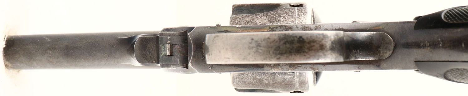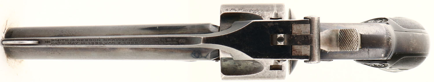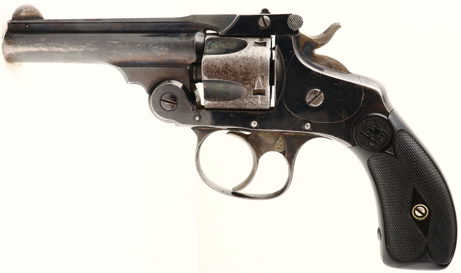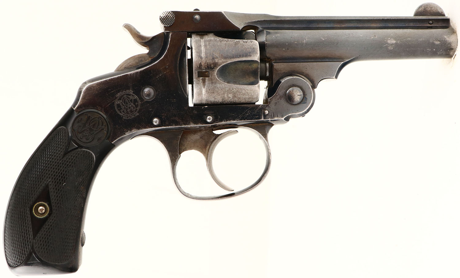 S&W, Break top, .32 cal., S/N: 218925. MFG. 1909-37. 3'' barrel, double action revolver, The S&W monogramed & checkered hard rubber grips are very good, with some edge wear & rubs. The original polished blue finish is retained at 65%, except cylinder is worn to a silver tone. Trigger & hammer have some case-colors, The bore is very good, with some roughness. The action is tight & functions correctly. FFL or C&R Req - Value: 200 to 400