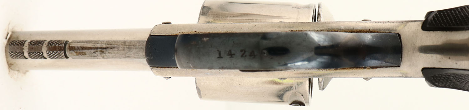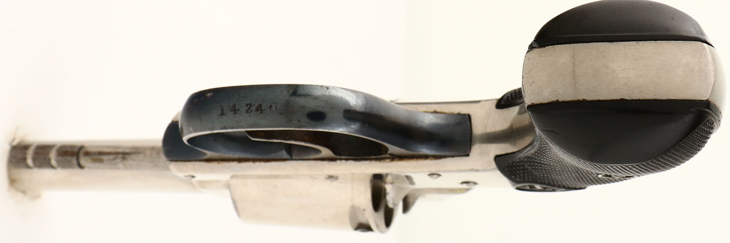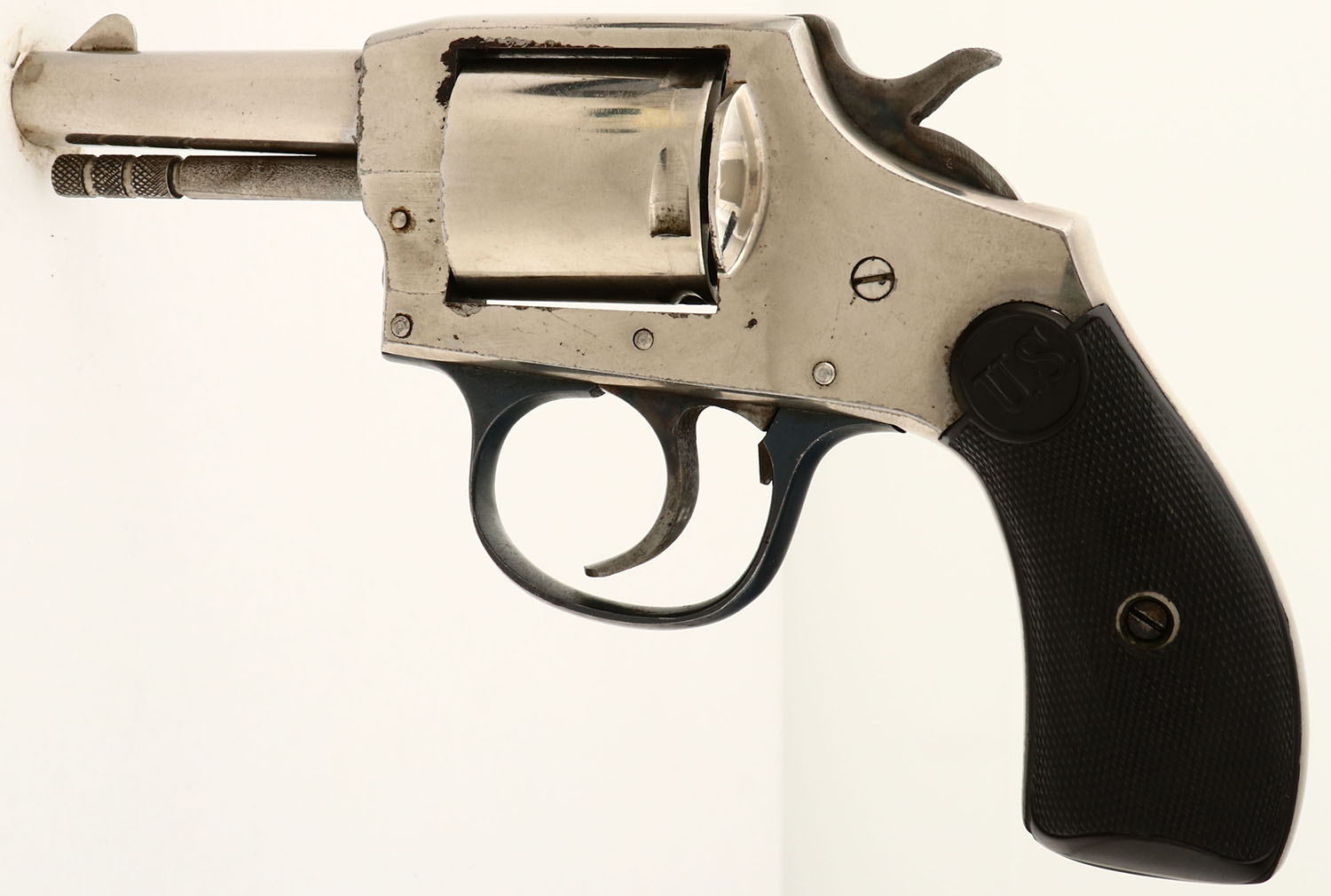 U.S. Revolver Co. Model: Solid Frame. CAL: .32 RF. MFG: 1910. S/N: 14249. Double-Single action. 2 1/2'' round barrel. The hard rubber grips are very good, with light wear. The metal nickeled finish rates 95%, with very little wear. Top of frame is marked, ''U.S. REVOLVER CO'', grips are marked, ''U.S.''. Bore is very good. Front blade sight. Trigger & hammer appear to function properly, but does not advance cylinder. Will need repair or adjustment. Sold AS-IS without return. FFL or C&R Req. - Value: 100 to 300