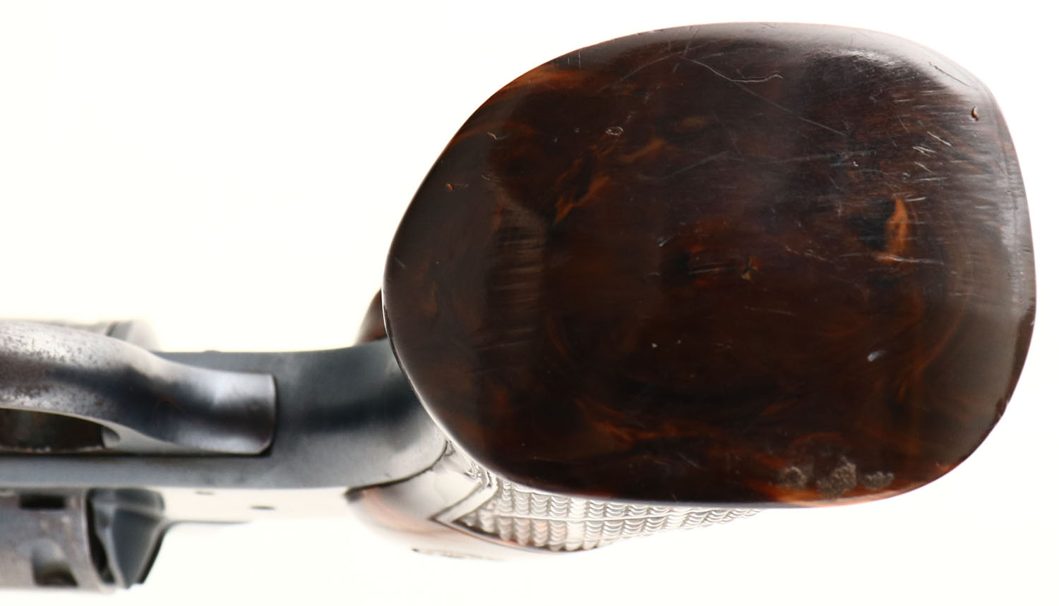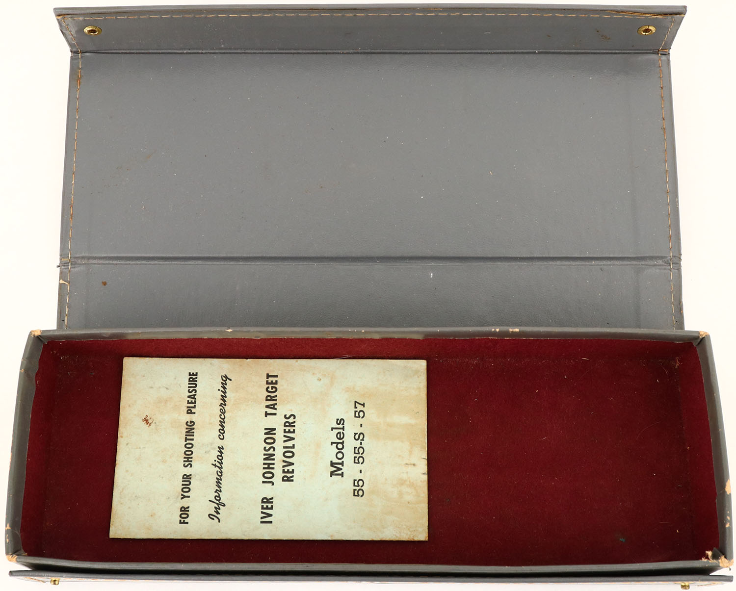 BOXED, Iver Johnson Arms & Cycle Works Model 55 Target, CAL: 22, MFG: 1955, SN: H447, Double Action Revolver. The original checkered plastic, wood appearance, grips are excellent. The metal blue finish is 90% overall, with nice case-colors to hammer & trigger. Bore is very good. Factory sights. Action & cylinder timing appear to function correctly. Comes in the original factory light gray leatherette case, which is in great condition, with gold lettering on top & brochure inside. FFL or C&R Req. - Value: 300 to 600