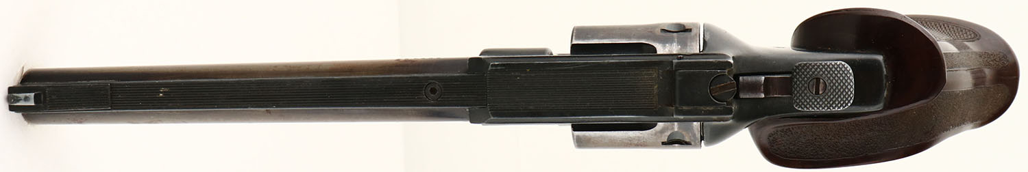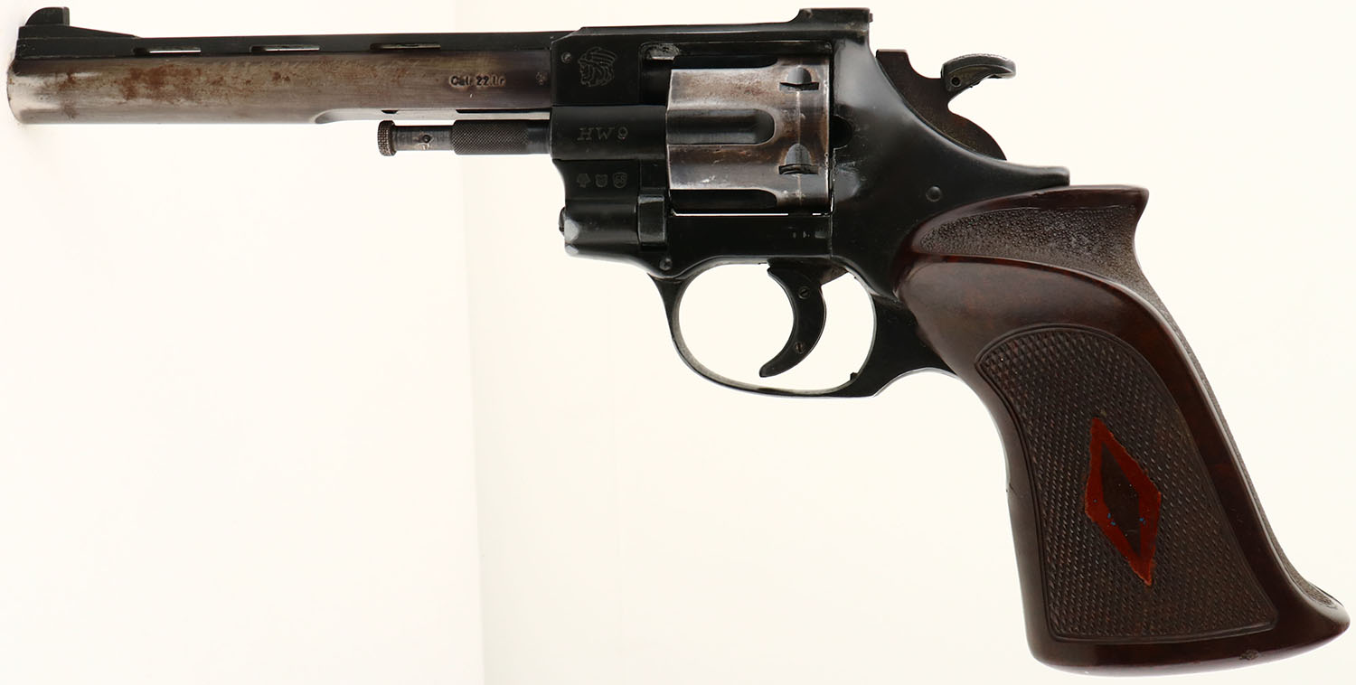 Arminius, Model HW9, Cal. .22 LR, Mfg. 1970's, SN: 259424, Double action revolver pistol, 6'' Ribbed barrels, The checkered wood grips are excellent with minor wear, Metal blue finish has worn mostly gun metal gray on the barrel & 80% on frame, Bore is excellent. Has grooved vent rib barrel, target wood grips & target trigger. Missing rear sight. FFL Req. - Value: 150 to 300