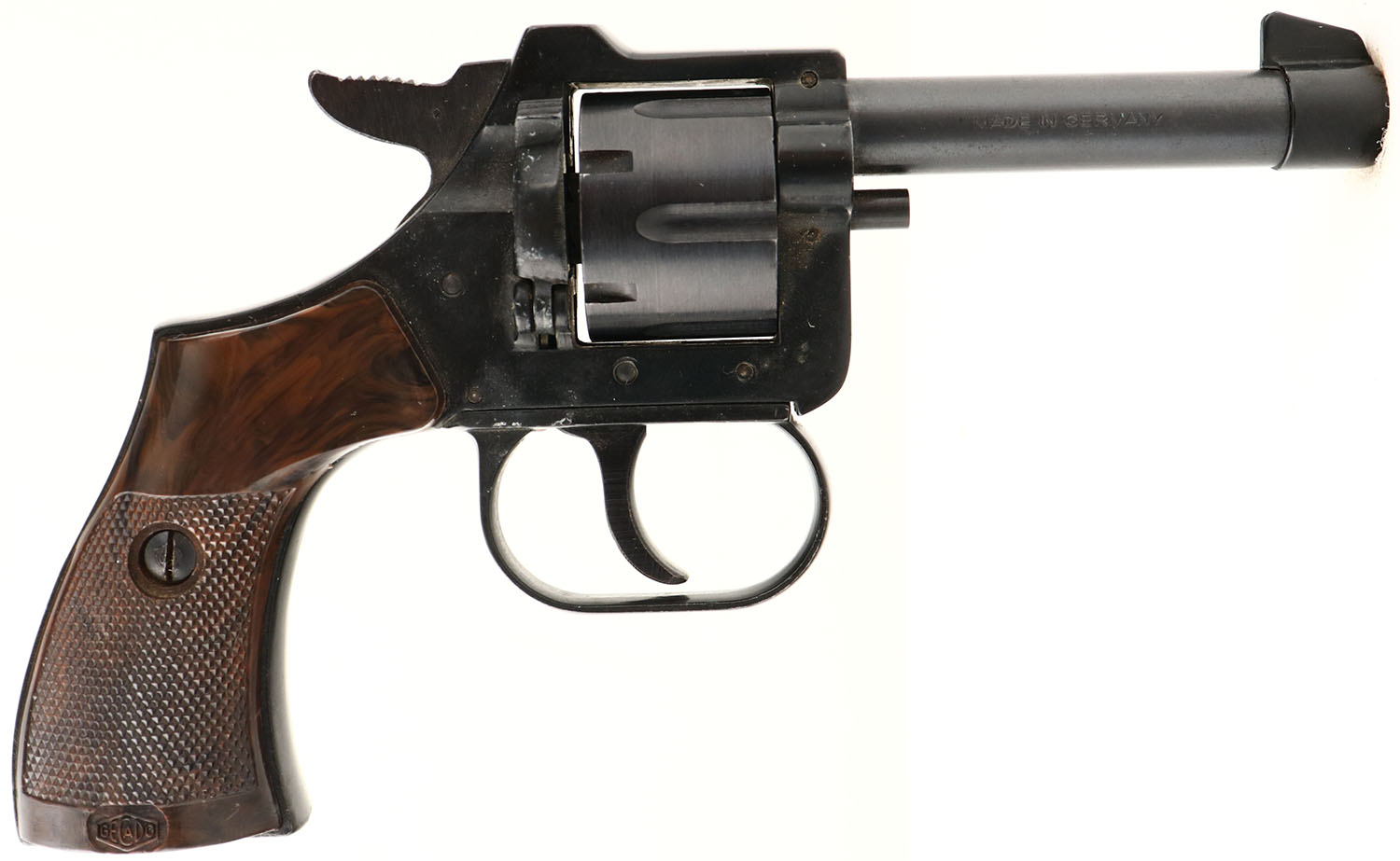 Gecado, .22 Short Cal, MFG 1950-60's, SN: 227152, Double Auction Revolver Pistol, 2 7/8'' barrel, The checkered brown plastic grips are excellent, The original blue finish is 90%, Bore is excellent. FFL Req. - Value: 50 to 100