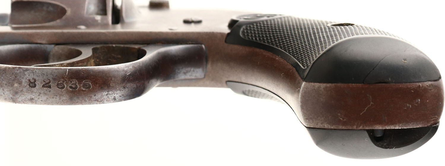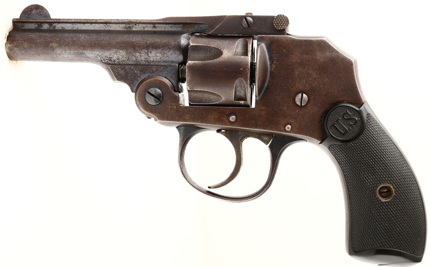 U.S. Revolver Co., Top Break Auto Ejecting Model, CAL: 32, MFG: 1920's, SN: 82636, Double Action Revolver, 3'' barrel, 5 shot. The top of the rib is marked ''U.S. Revolver Co. Made In USA''. The U.S. marked hard rubber checkered grips are very good. The metal blue finish has tones to a brown patina, with remains of original blue in protected areas. Bore is very good, with some roughness. Factory sights. Hammerless for ease of personal carry. Action & cylinder timing function properly. FFL or C&R Req. - Value: 50 to 200