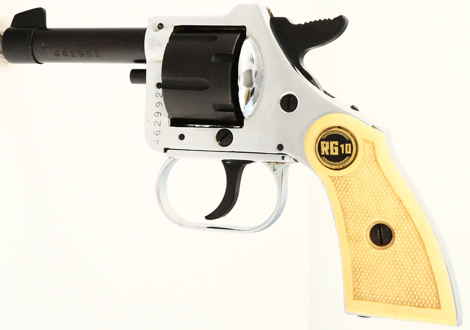 Rohm, Model RG-10, .22 Short Cal, MFG 1960's, SN: 462992, Double Auction Revolver Pistol, 2 1/2'' barrel, The checkered plastic grips are very good. The polished nickel frame finish is excellent, with barrel & cylinder showing 90% blue. Bore is excellent. FFL or C&R Req. - Value: 50 to 100
