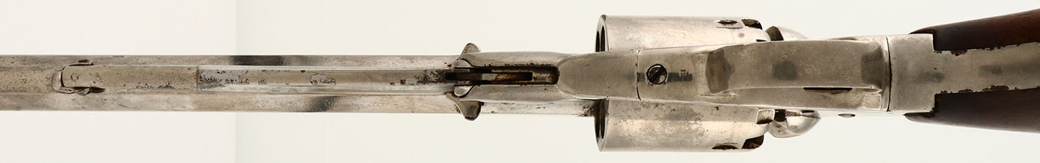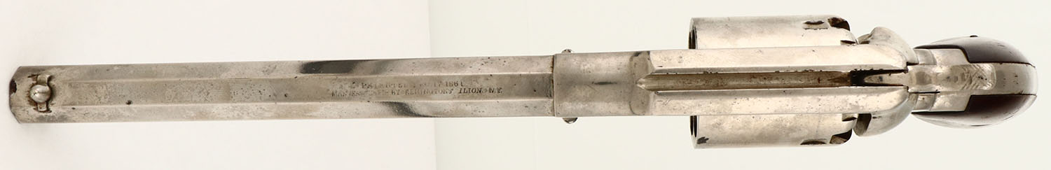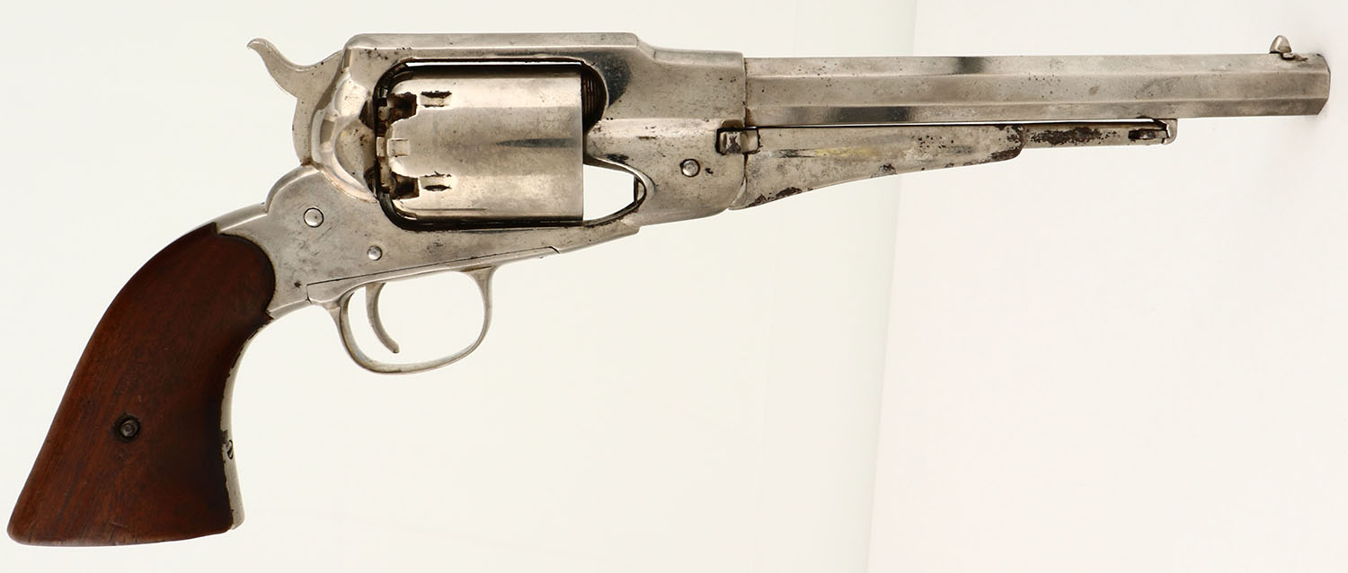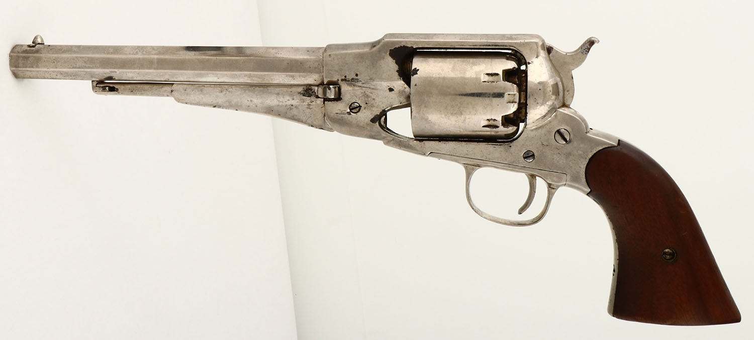 Remington, Model 1861 Army, .44 caliber, MFG: N/A, SN: 11483, The Remington navy is a single-action, six-shot, Large-frame percussion revolver produced by Remington's, Ilion, N.Y. plant. 8''Octagon barrel. The wood grips are very good, with minimal shrinkage & minor handling marks. The pistol has been re-nickeled, with the nickel showing haze from age & use. Some rust speckling, edge wear & flaking. Bore is good, but with areas of pitting amongst strong rifling. Appears to function properly. Condition is well used, but not abused. Black Powder, No FFL Req. - Value: 500 to 1000