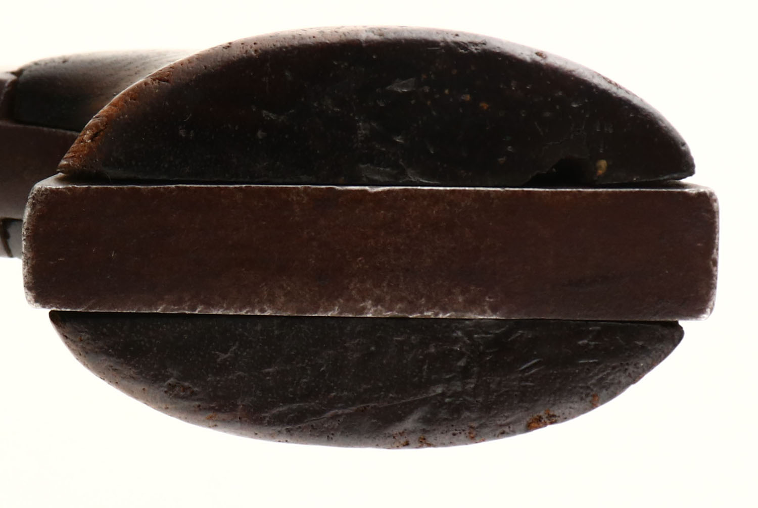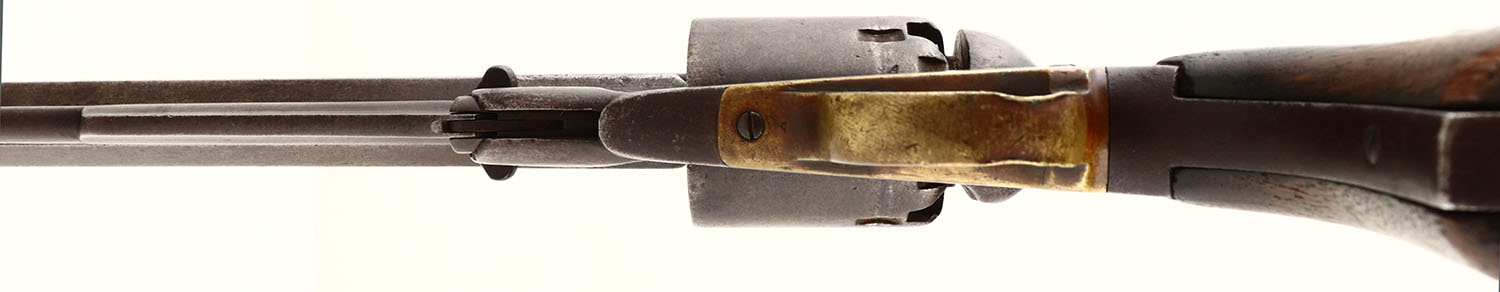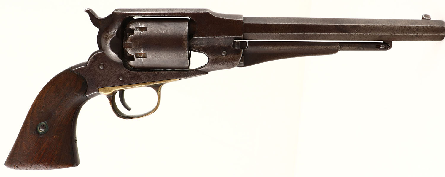 E. Remington & Sons, New Model Army, .44 Percussion, MFG. 1858-75, SN: 76172 & all matching numbers. 8'' Oct. barrel, The original 2 pc wood grips are very goodl, showing edge wear & nicks. The revolver has toned to an even chocolate brown patina, with speckling & minor abrasions. Bore is good, but with some pitting amongst good rifling. Pinched post front sight. 2-line address on top barrel flat reads: Patented Sept 14 1858 - E.Remington & Sons. Illion New York U.S.A. The left side for frame inspectors initials ''H'' stamp, The front of the trigger guard is stamped with a ''A'' stamp. There is a ''R'' stamped on the loading lever, an ''A'' stamped on cylinder. Ther cylinder indexes properly & all nipples are intact. There is a worn cartouche, lettering in a square box, on left grip. Antique No FFL Req - Value: 800 to 2000