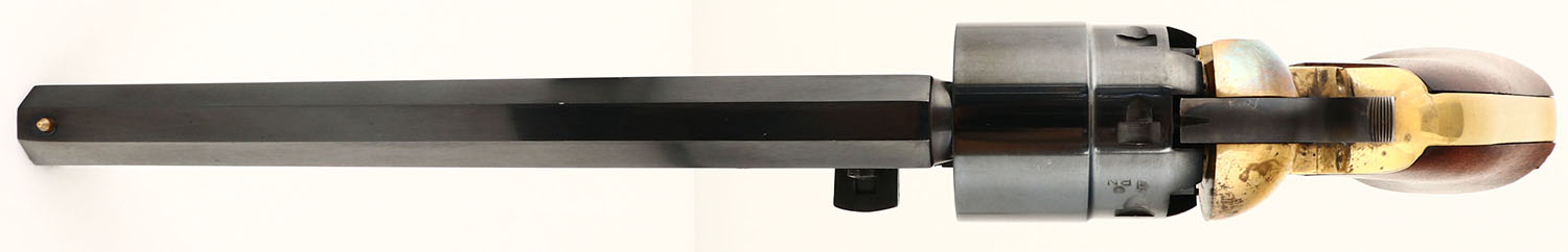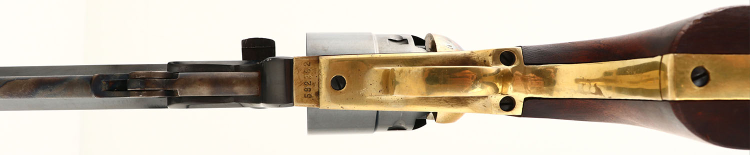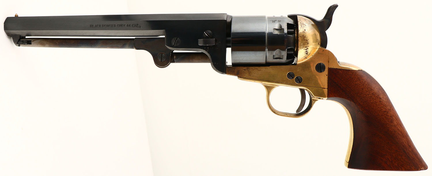 F. LLI Pietta, Model 1851 Navy, CAL: 44, MFG: Modern, SN: 592362, Black Powder Percussion Revolver, 7 3/8'' barrel. The original wood grips are excellent. The factory blued barrel & cylinder are excellent, brass frame is excellent, the case-hardened hammer, trigger & loading lever have vivid case-colors. All finishes rate 99%+. Bore is excellent. The barrel carries a single gold post bead. A high condition, modern black powder revolver. Matching revolver in also in previous & next lots. Black Powder, No FFL Req - Value: 250 to 500