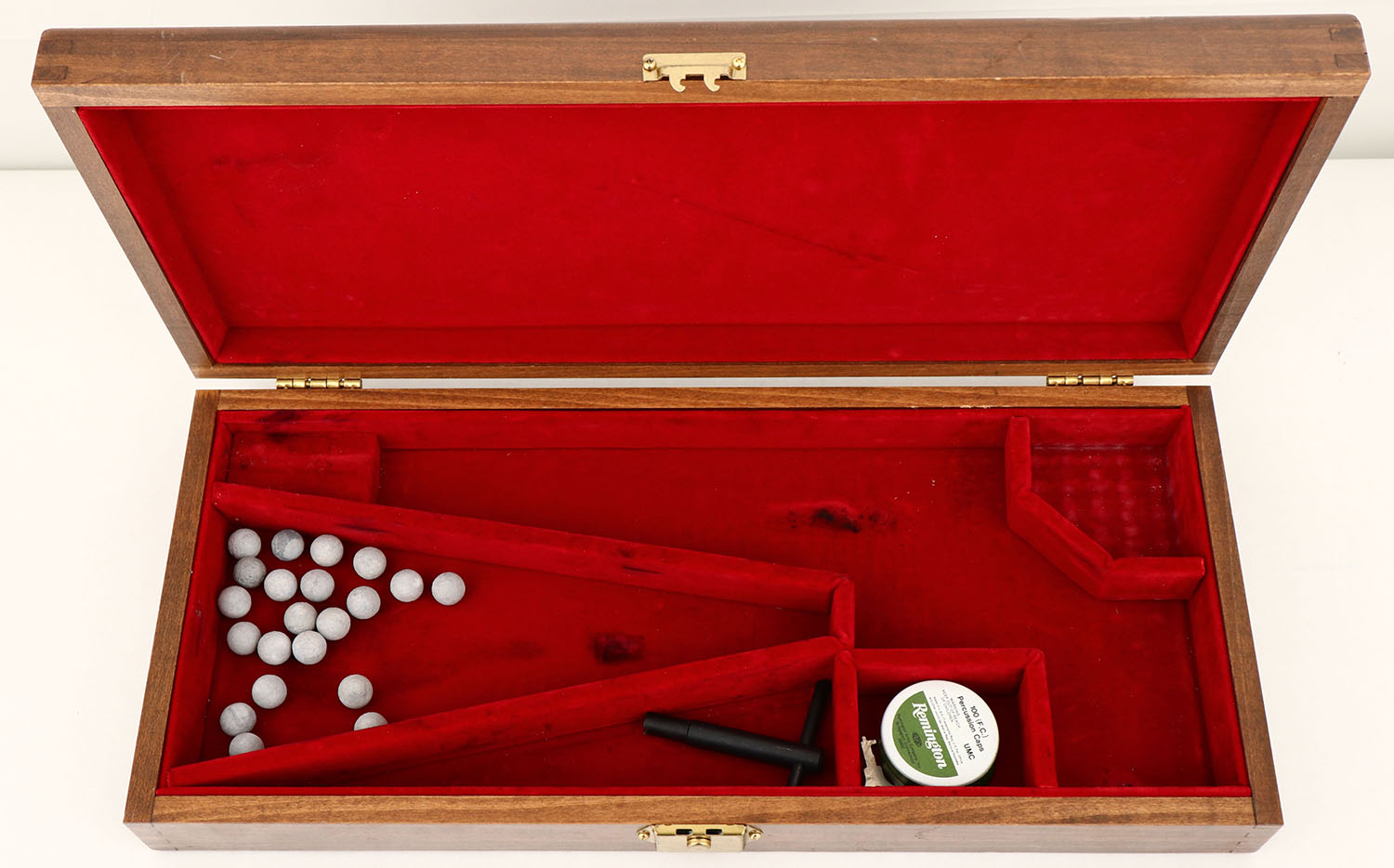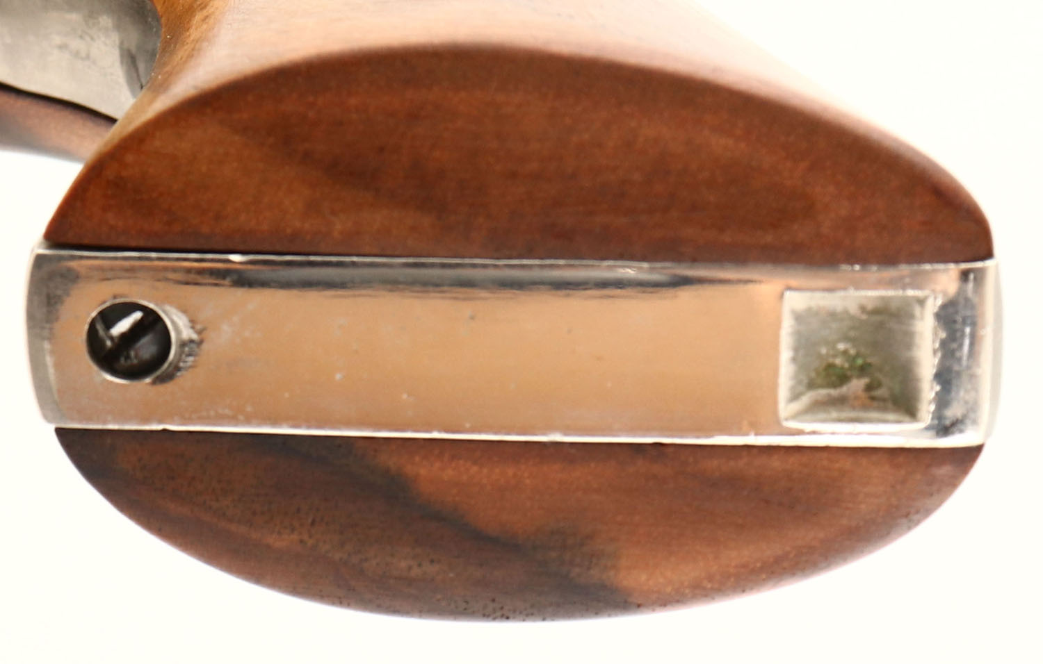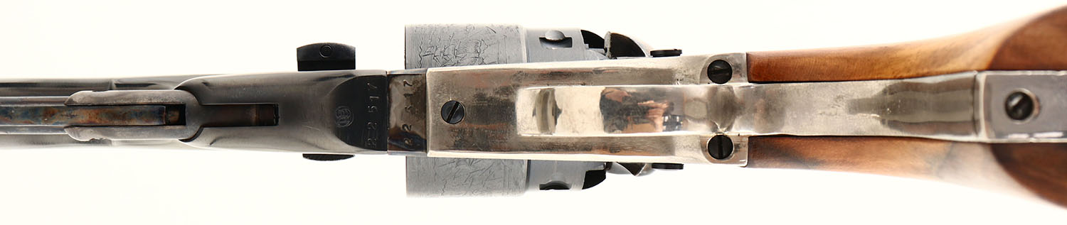 Lyman, Model 1860 Army, CAL: 44, MFG: Modern, SN: 22517, Black Powder Percussion Revolver, 7 3/4'' barrel. The wood grips are excellent. The engraved cylinder & barrel retain 98% original blue finish. The trigger, hammer, loading lever & frame all have vivid case-colors. The trigger guard & back strap retain 98% of nickel finish. Bore is excellent. The barrel carries a brass bladed front sight. Comes in a walnut wood box with a red lining, has tool, caps & old lead balls. A high condition, modern black powder revolver. Black Powder, No FFL Req - Value: 250 to 500