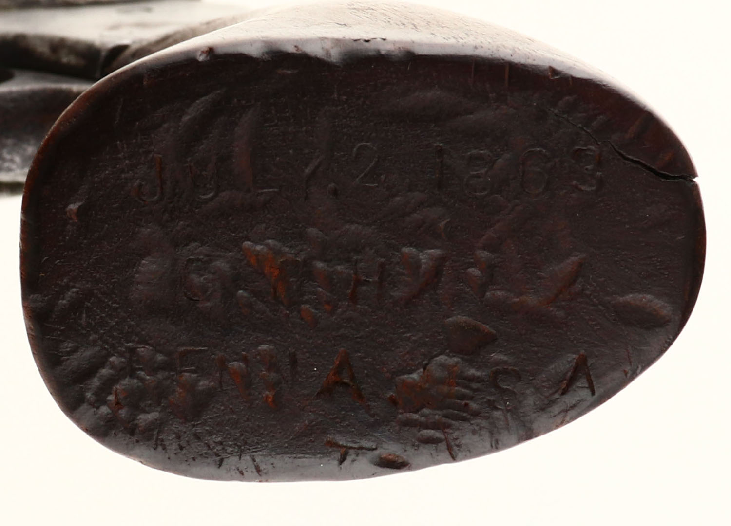 Starr Arms, Model 1858 Army, CAL: 44, MFG: Late 1850's - early 60's, SN: 22313, Single Action Percussion Revolver, 8'' barrel. The left side of the frame is faintly stamped ''STARR ARMS NEW YORK'', the cylinder is marked with the full SN, & the right side of the frame has a barely legible patent date ''JAN 18 18XX''. The bottom of the wood grips is stamped ''JULY 2 1863'', over a two line ''G H H'', '' xENNAxxSA''. The wood grips are good, displaying contusions, scrapes & dings, with a 1'' crack near the butt. The metal has toned to a mix of metal grey & brown patina, with spotting, cleaned pitting & buff lines on the frame. Bore is fair, with consistent pitting throughout. The barrel carries a blade front sight. Action & cylinder are functional, but not in sync. There were appx 23,000 of this variant produced. By numbers alone (47,000 in total), the Starr Double-Action was one of the most widely available & in-service revolvers of the American Civil War.* Antique, No FFL Req. - Value: 500 to 1000