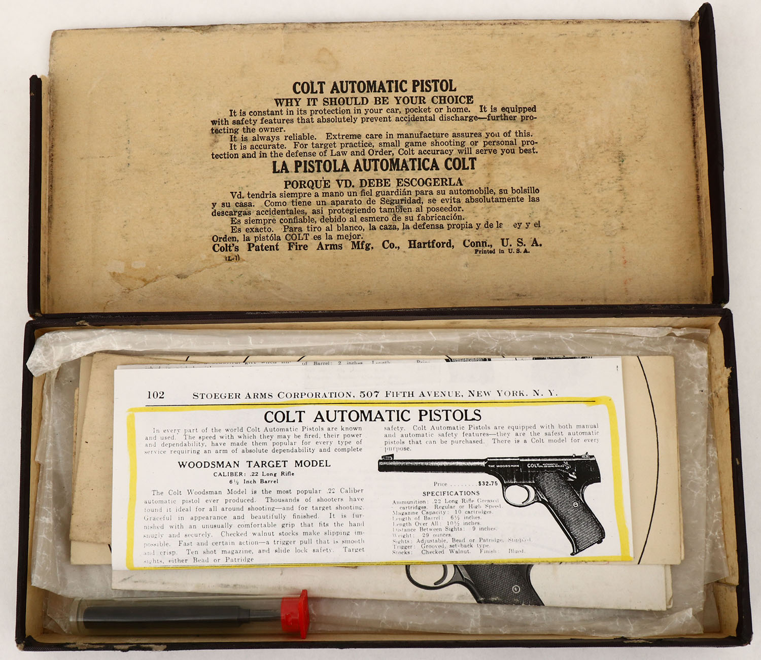 BOXED, Colt, Model ''The Woodsman'', CAL: 22 LR, MFG: 1940, SN: 135615, Semi Auto Pistol, 6 5/8'' barrel. The original checkered wood grips are excellent. The original metal blue finish rates 98% overall, with minor scuffs. Bore is excellent. The slide holds an adjustable Target Partridge rear sight & pinned blade front sight. Comes in original box, with paperwork, original packaging, factory test target & tool. Box has edge wear & glue repairs at the corners & edges, missing front lip. A high condition Colt Woodsman. FFL or C&R Req. - Value: 1000 to 2000