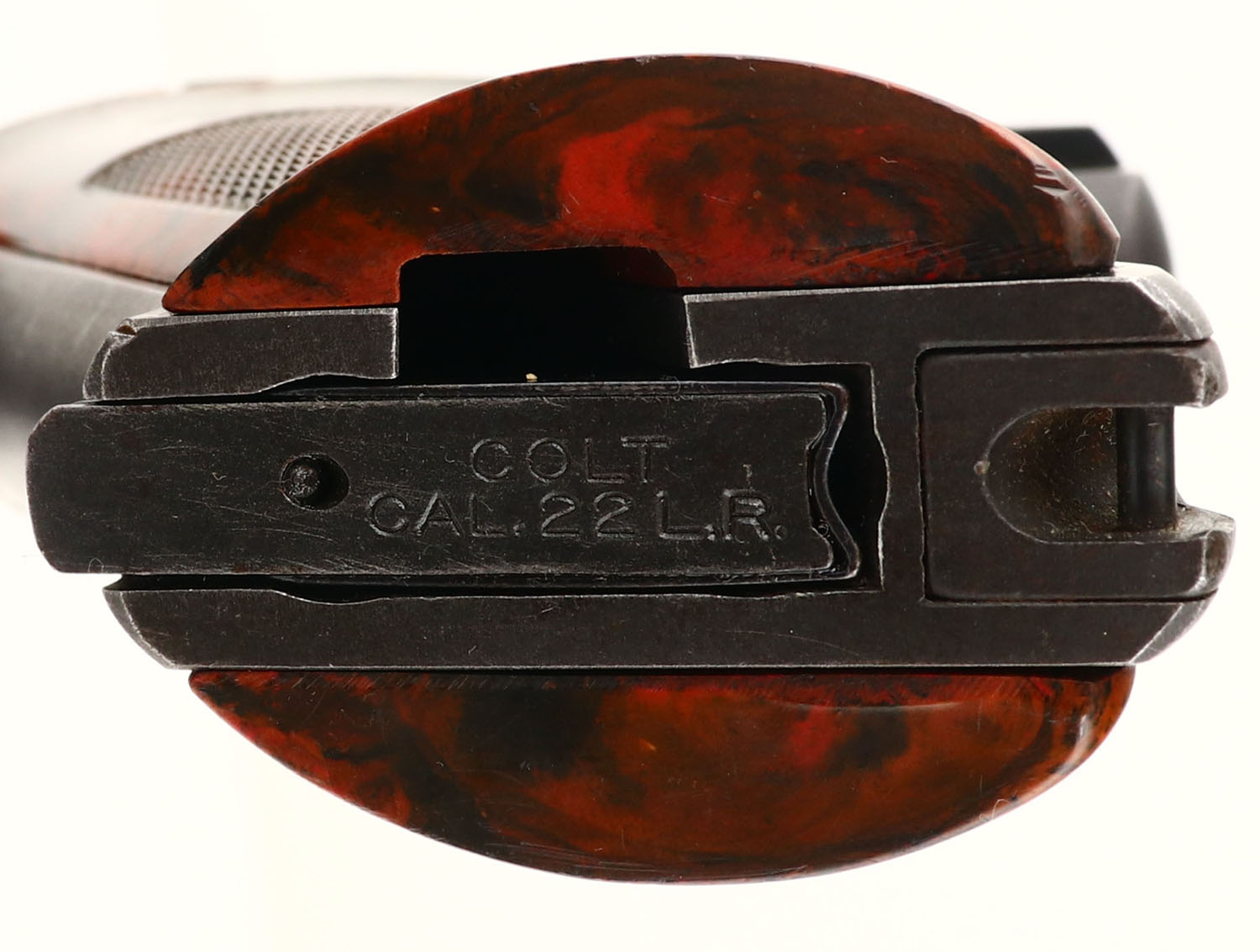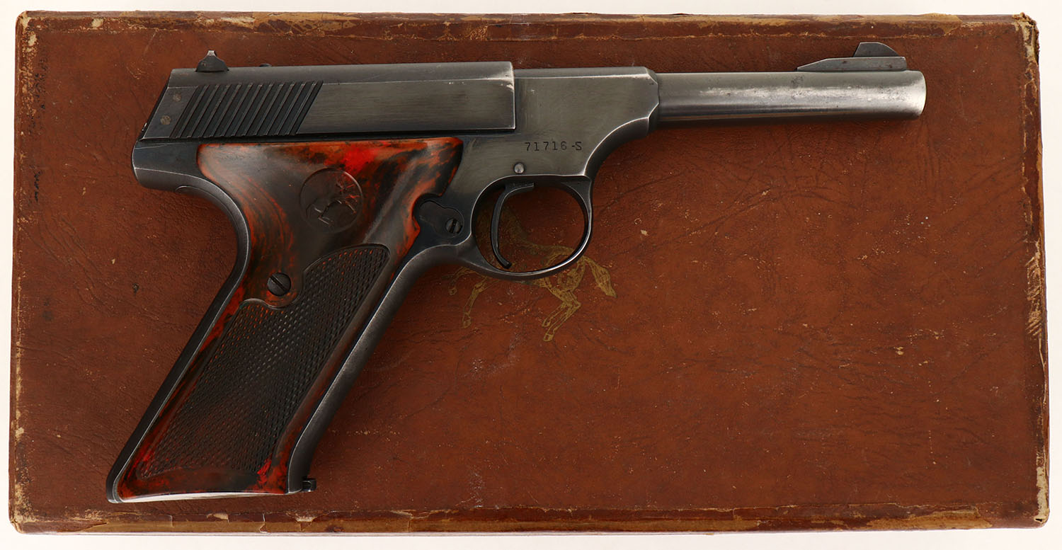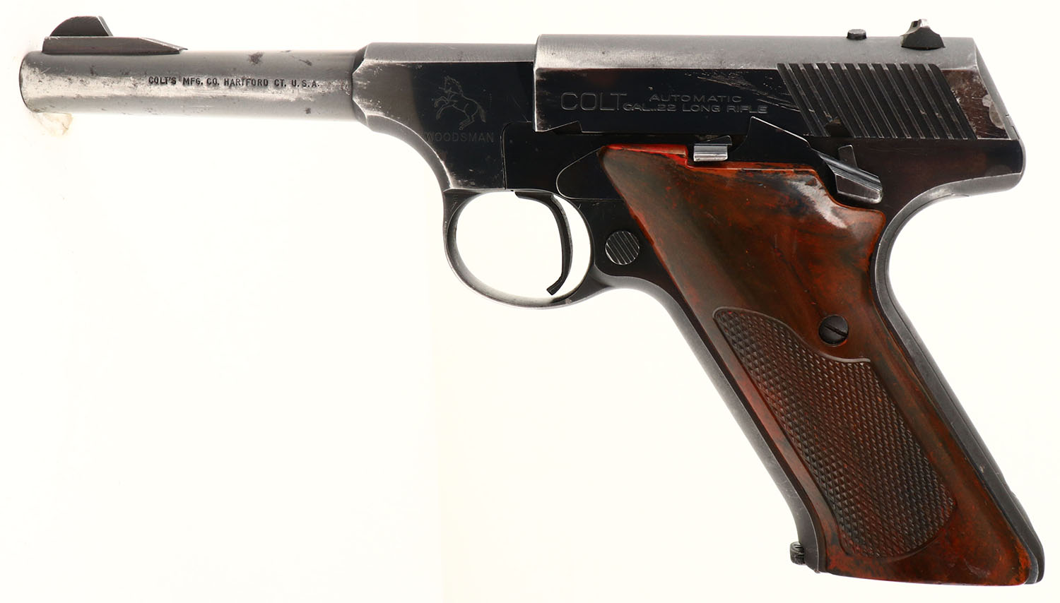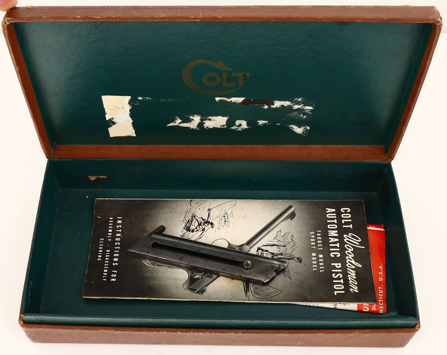 BOXED, Colt, ''Woodsman Sport'' 2nd Model, CAL: 22LR, MFG: 1951, SN: 71716-S, 4 1/2'' barrel. The original Colt checkered plastic grips are excellent. The right grip displays an impressed Rampant Colt.. The metal blue finish rates 70% overall. Bore is excellent. Factory sights. Comes in original box, with extra mag & instruction manual. Box is very good, with light edge wear. FFL or C&R Req. - Value: 600 to 1000